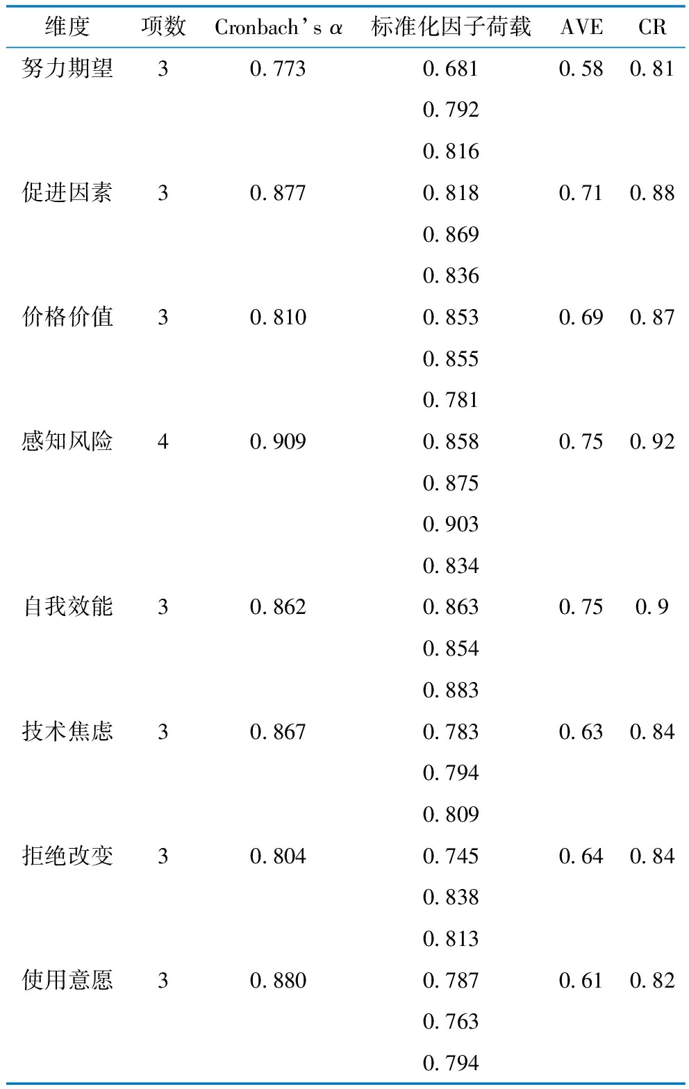 维度项数Cronbach’s α标准化因子荷载AVECR努力期望30.7730.6810.580.810.7920.816促进因素30.8770.8180.710.880.8690.836价格价值30.8100.8530.690.870.8550.781感知风险40.9090.8580.750.920.8750.9030.834自我效能30.8620.8630.750.90.8540.883技术焦虑30.8670.7830.630.840.7940.809拒绝改变30.8040.7450.640.840.8380.813使用意愿30.8800.7870.610.820.7630.794