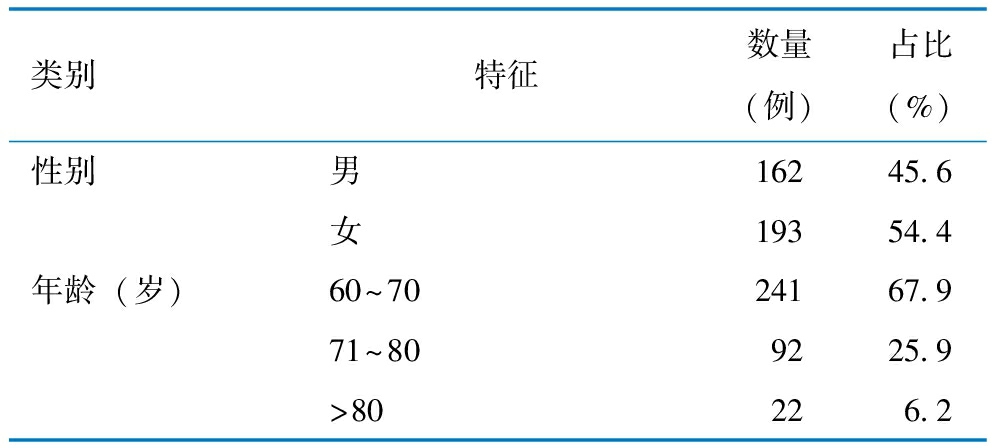 类别特征数量(例)占比(%)性别男16245.6女19354.4年龄(岁)60~7024167.971~809225.9>80226.2
