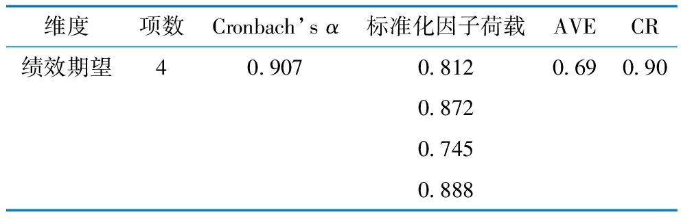 维度项数Cronbach’s α标准化因子荷载AVECR绩效期望40.9070.8120.690.900.8720.7450.888