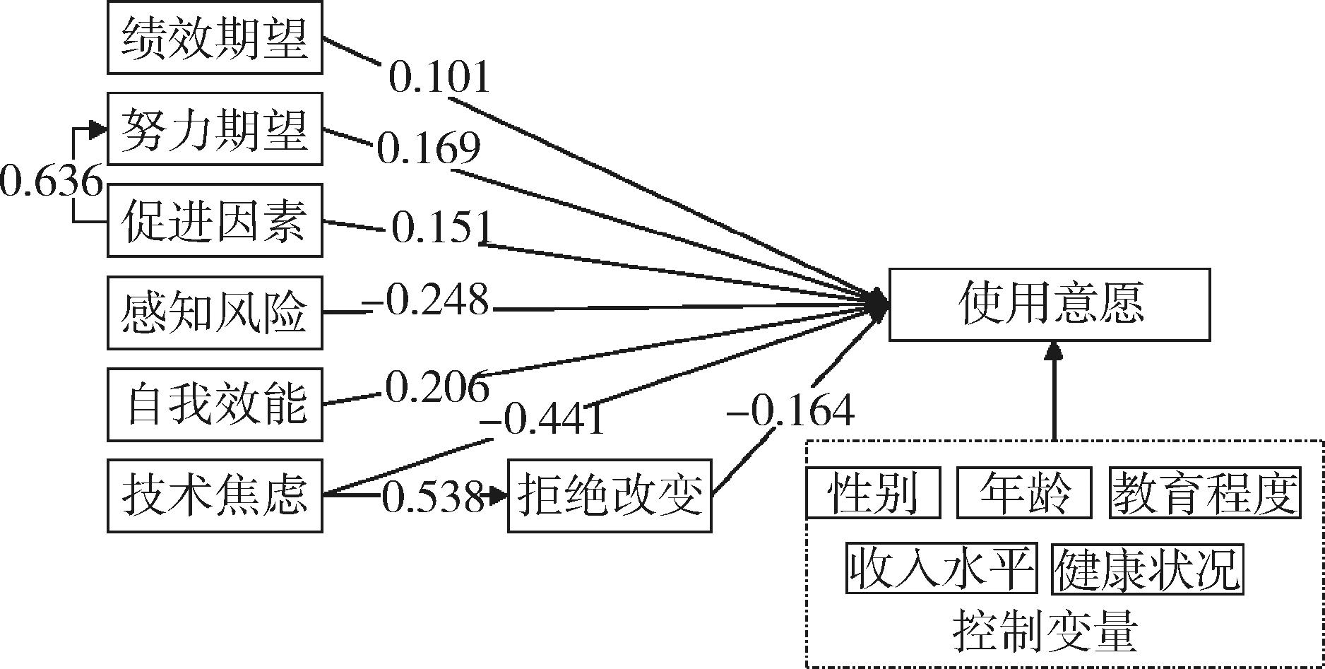 假设路径路径系数SECRP显著性检验H1使用意愿←绩效期望0.1010.0522.0570.041显著 H2使用意愿←努力期望0.1690.0673.1790.001显著 H3使用意愿←促进因素0.1510.0602.7840.005显著 H4努力期望←促进因素0.6360.0609.229∗∗∗显著 H5使用意愿←价格价值-0.0430.060-0.7700.440不显著H6使用意愿←感知风险-0.2480.040-6.559∗∗∗显著 H7使用意愿←自我效能0.2060.0425.499∗∗∗显著 H8使用意愿←技术焦虑-0.4410.057-7.850∗∗∗显著 H9拒绝改变←技术焦虑0.5380.0439.237∗∗∗显著 H10使用意愿←拒绝改变-0.1640.061-3.664∗∗∗显著