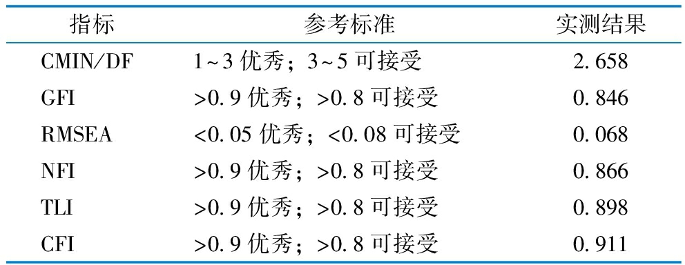 指标参考标准实测结果CMIN/DF1~3优秀;3~5可接受2.658GFI>0.9优秀;>0.8可接受0.846RMSEA<0.05优秀;<0.08可接受0.068NFI>0.9优秀;>0.8可接受0.866TLI>0.9优秀;>0.8可接受0.898CFI>0.9优秀;>0.8可接受0.911