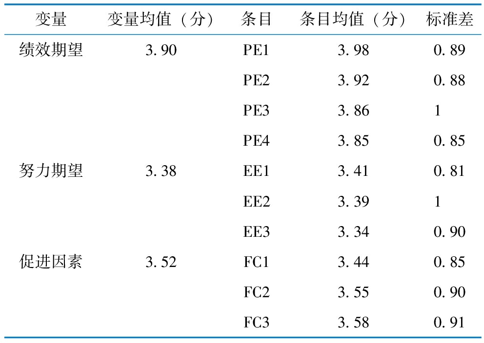 变量变量均值(分)条目条目均值(分)标准差绩效期望3.90PE13.980.89PE23.920.88PE33.861PE43.850.85努力期望3.38EE13.410.81EE23.391EE33.340.90促进因素3.52FC13.440.85FC23.550.90FC33.580.91