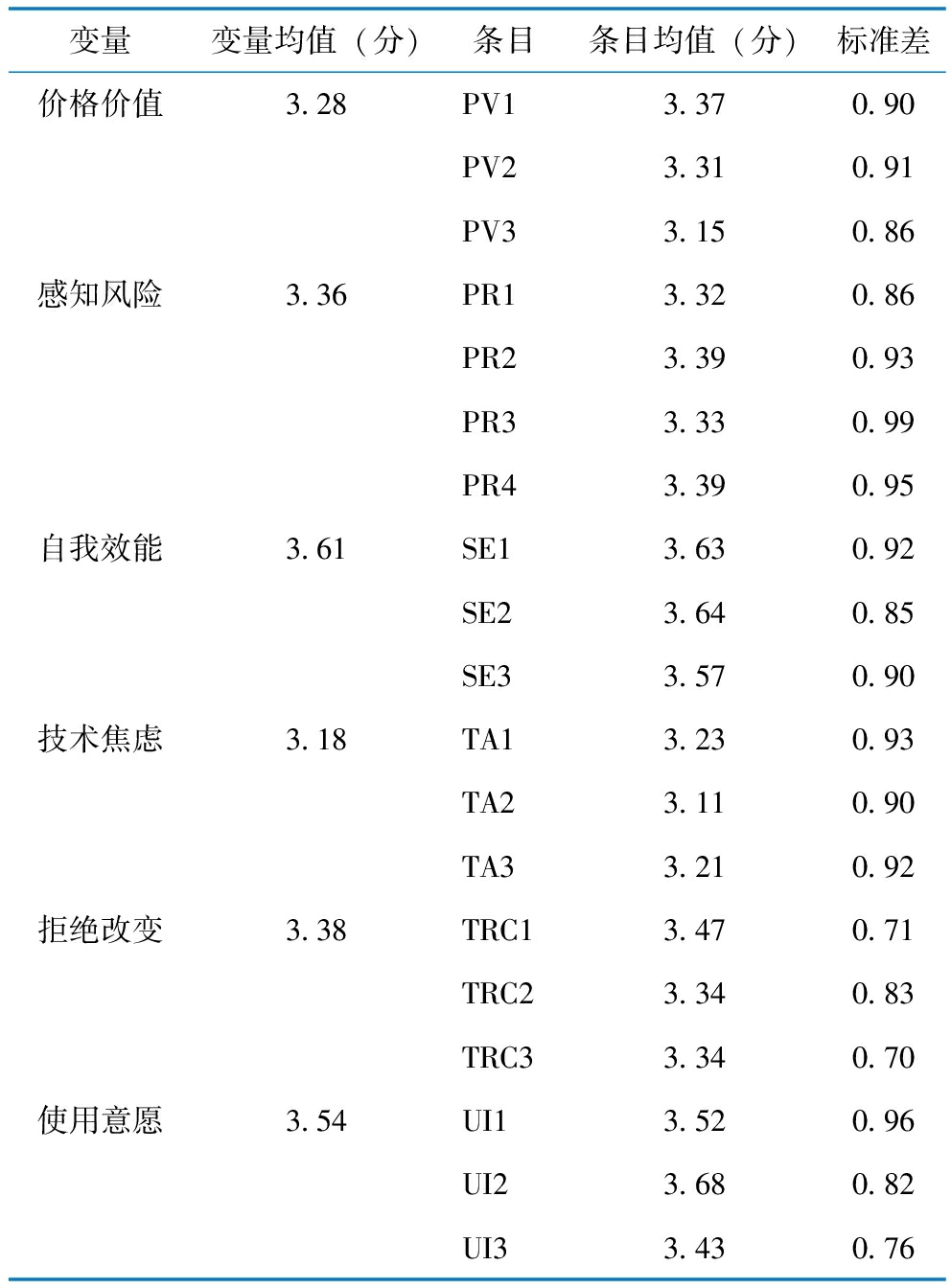 变量变量均值(分)条目条目均值(分)标准差价格价值3.28PV13.370.90PV23.310.91PV33.150.86感知风险3.36PR13.320.86PR23.390.93PR33.330.99PR43.390.95自我效能3.61SE13.630.92SE23.640.85SE33.570.90技术焦虑3.18TA13.230.93TA23.110.90TA33.210.92拒绝改变3.38TRC13.470.71TRC23.340.83TRC33.340.70使用意愿3.54UI13.520.96UI23.680.82UI33.430.76