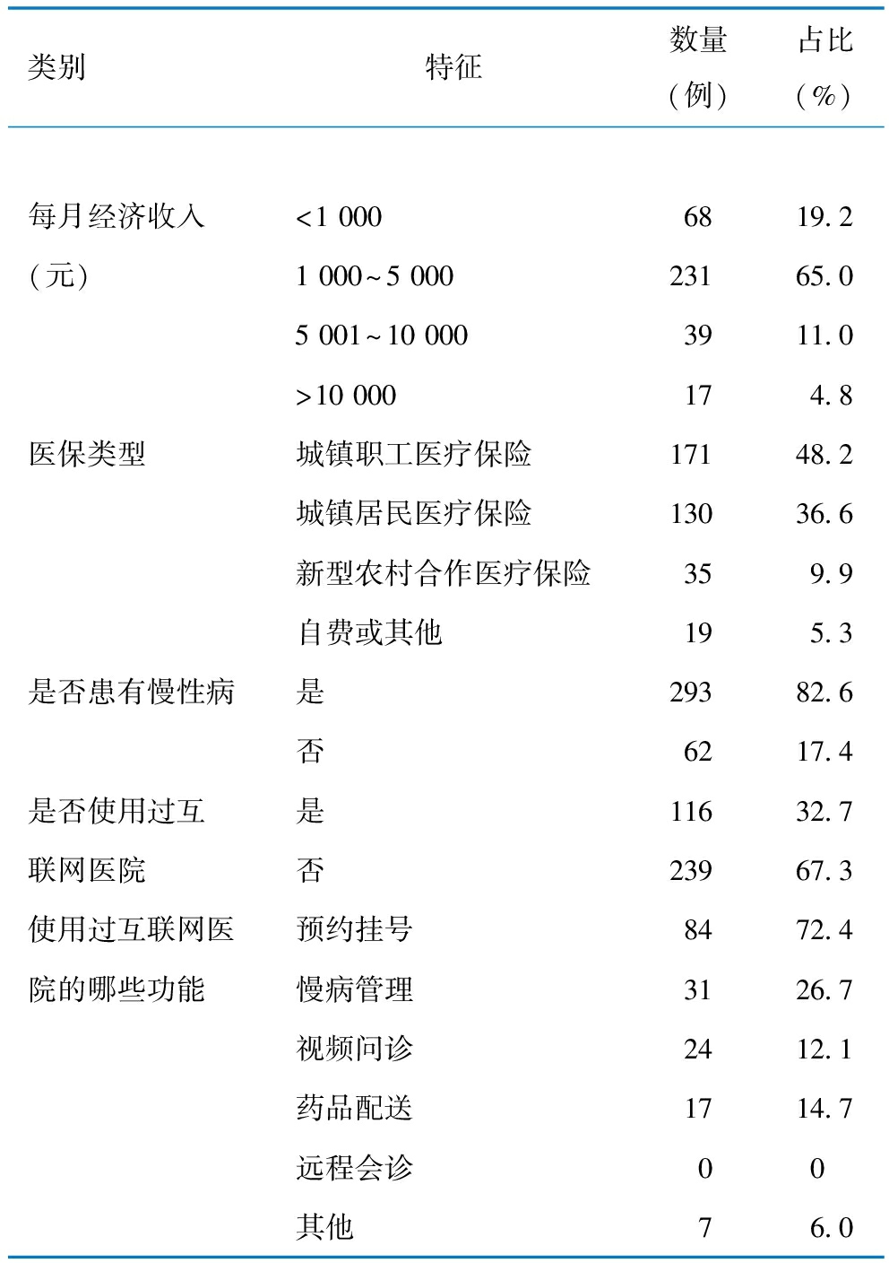 类别特征数量(例)占比(%)每月经济收入<1 0006819.2(元)1 000~5 00023165.05 001~10 0003911.0>10 000174.8医保类型城镇职工医疗保险17148.2城镇居民医疗保险13036.6新型农村合作医疗保险359.9自费或其他195.3是否患有慢性病是29382.6否6217.4是否使用过互是11632.7联网医院否23967.3使用过互联网医预约挂号8472.4院的哪些功能慢病管理3126.7视频问诊2412.1药品配送1714.7远程会诊00其他76.0