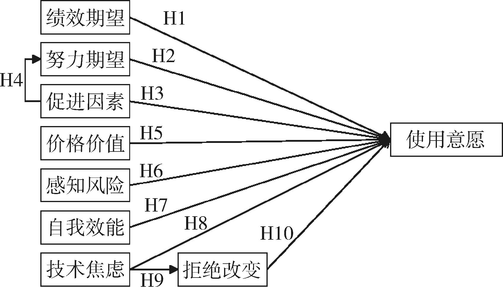 技术焦虑(technology anxiety,TA)指用户使用信息技术时,因与技术源互动产生的焦虑、恐惧等负性情绪[16]。老年人接受新技术、新服务时的紧张和焦虑,会使其认为使用困难,不愿改变,进而影响使用意愿。Hoque R等[17]证实技术焦虑负向影响老年群体对移动医疗服务的使用意愿。因此提出假设H8:技术焦虑负向影响老年人对互联网医院的使用意愿。假设H9:技术焦虑正向影响老年人对互联网医院的拒绝改变。