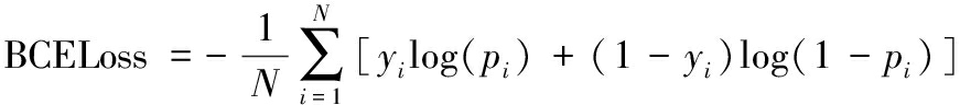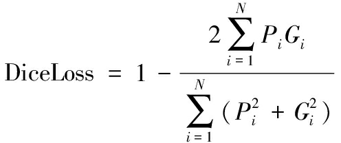 实验在Linux平台完成,使用PyTorch1.11.0搭建模型,使用NVIDIA GeForce RTX 3090 GPU进行训练。损失函数是评估模型预测输出与真实值之间差异程度的函数,量化了模型预测错误的程度,模型通过不断调整内部参数来最小化损失函数的值,从而提高数据拟合效果和模型的泛化能力。根据模型任务,将多分类改为二分类问题,选择适用于二分类问题的二元交叉熵损失(binary cross-entropy loss,BCELoss)作为基础损失,考虑到像素的不平衡性,增加DiceLoss对模型进行评估,两种损失的加权共同衡量模型的预测结果。其中N代表样本数量,yi代表真实值,pi代表预测值,Pi和Gi分别表示预测结果和真实标签在第i个像素上的值。