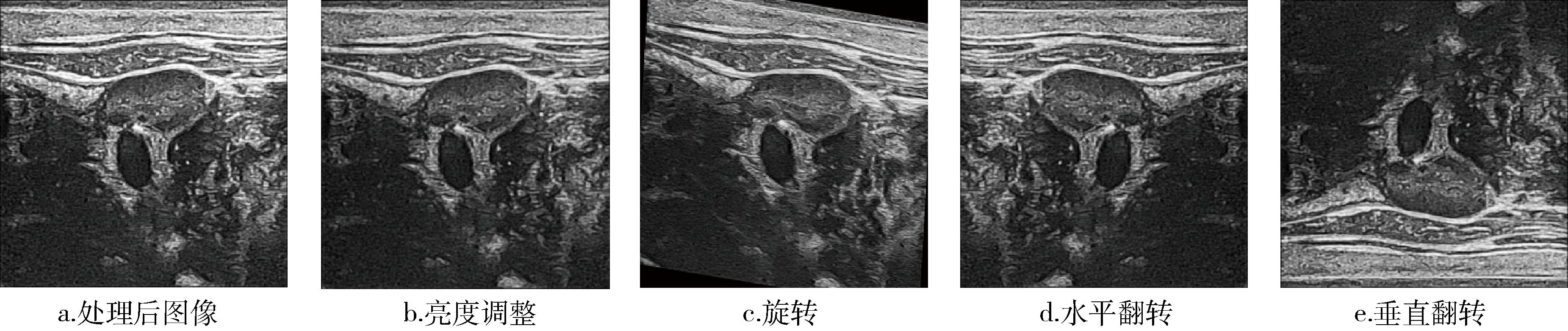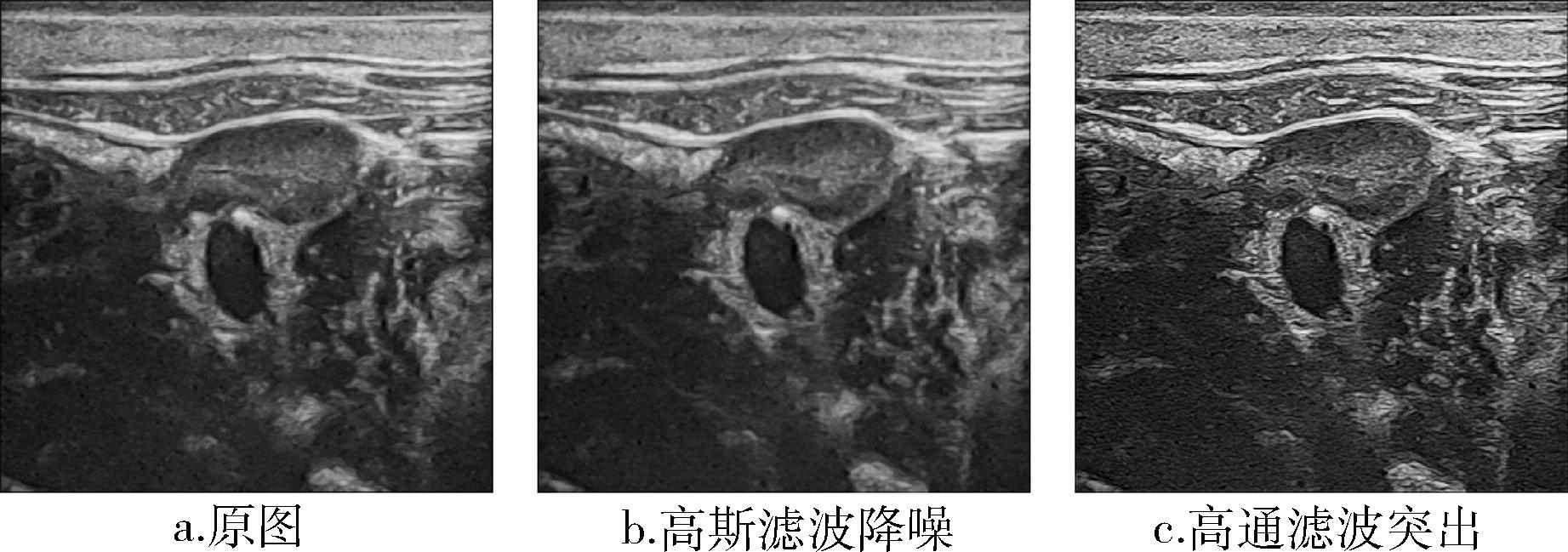 4.1.5 图像预处理 为减少设备本身及外部因素对图像质量的影响,对采集到的超声图像进行预处理。先对图像中的无关信息进行裁剪,并将图像尺寸调整为512×512,以匹配网络模型的输入要求。再对缩放后的图像进行滤波处理,以消除噪声、提高图像清晰度,并强化部分组织边界的对比效果,见图7。