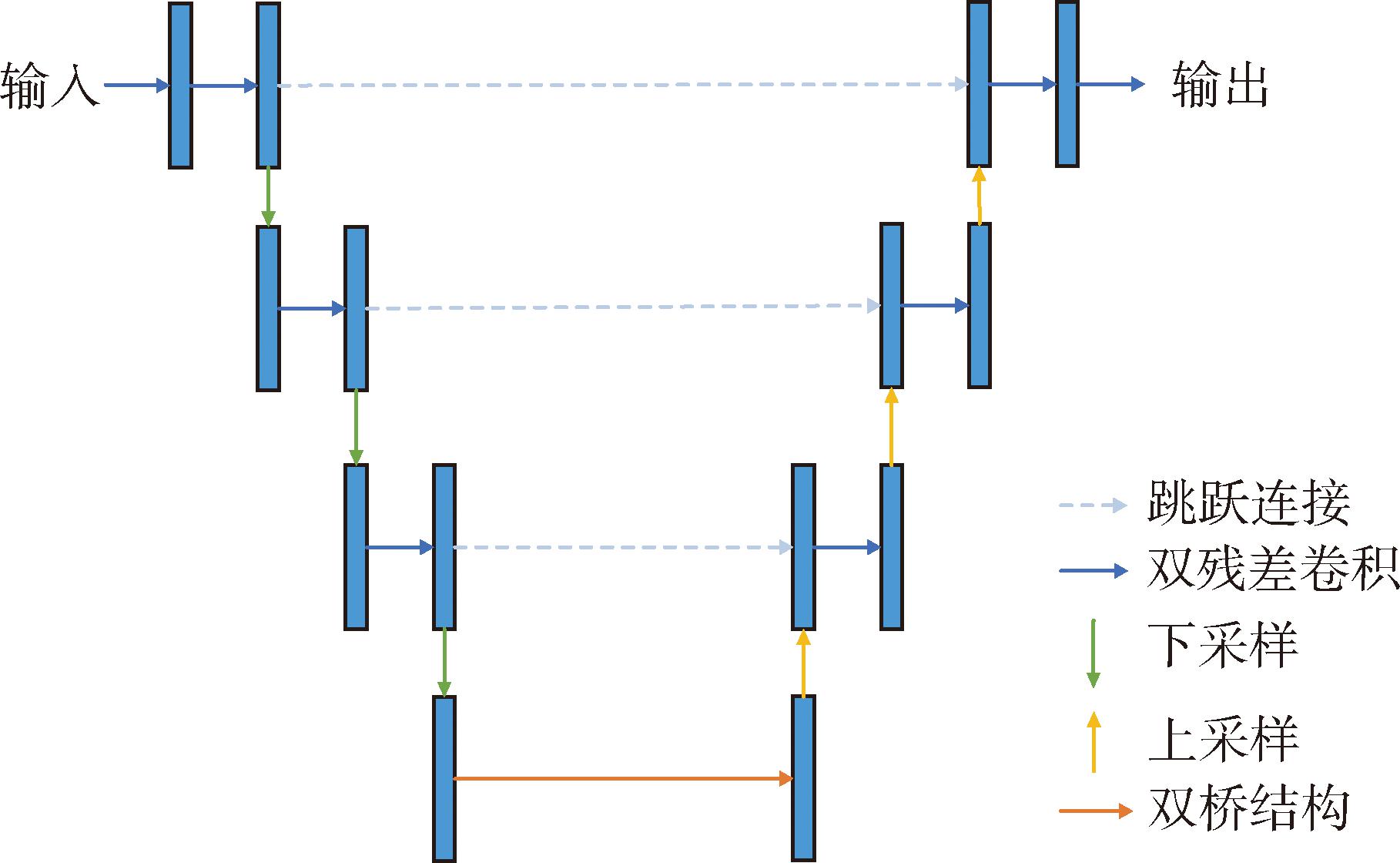 本研究构建的RDU-Net结构,见图4。输入图像大小为512×512。基于3层由双残差卷积块和下采样组成的编码器结构,图像特征被逐层压缩并传递至模型底部,此时采用双桥结构进行更深层次的特征学习。再基于3层上采样和双残差卷积块构成的解码器结构,逐步恢复特征图。解码阶段,模型通过跳跃连接将编码器中相同层次的低采样特征图与解码器中的特征图进行融合,从而弥补采样过程中丢失的信息,确保模型在细节恢复方面具有更好的表现。双残差卷积块及单卷积块结构,见图5。