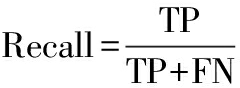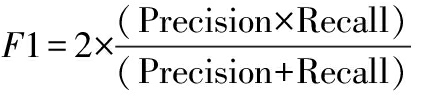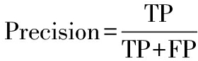 由于所分割部分在图片中所占的面积非常小,模型预测的正负类别不平衡,单纯使用精确度(precision)和召回率(recall)进行评价会使模型性能量化出现偏差,因此使用两者调和平均数F1分数进行量化。精确度是对模型预测准确程度的量化,代表预测为正类别的像素数量占实际为正类别的像素数量的比例。召回率指模型正确识别出的正例占所有实际正例的比例,是对模型预测可信程度的衡量。其中,TP为真正例的数量,FP为假正例的数量,FN为假负例的数量。