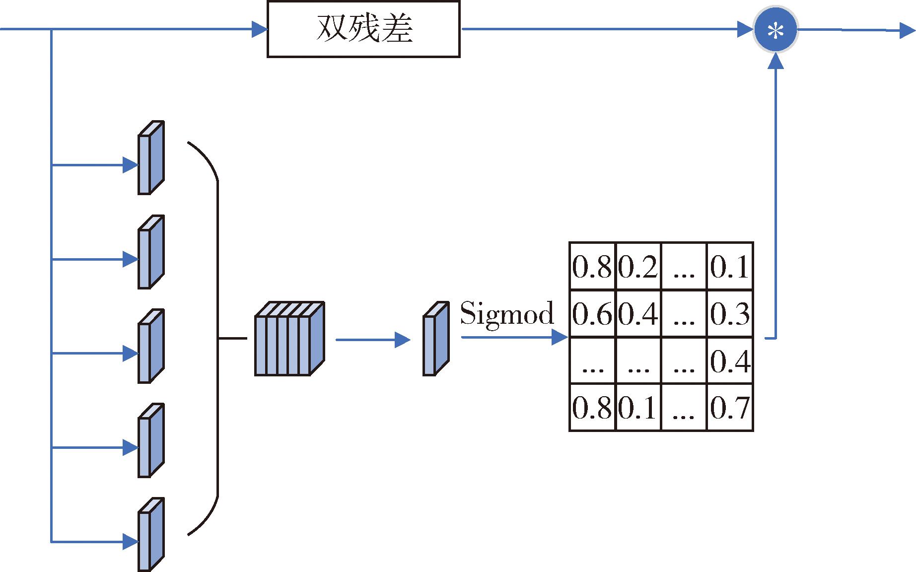 空洞卷积桥由空洞卷积金字塔构成,见图3。经过5层卷积块进行平行卷积,通过不同的空洞率对在底部的特征图进行特征提取,将不同尺度的特征图进行维度堆叠并融合成一个尺度特征图,通过引入Sigmod函数,该特征图被转化为表征空间位置特征重要性的概率权重矩阵,作用于双残差卷积桥的输出特征图,提高模型对特征的辨识能力,减少非特征区域对特征学习的干扰。