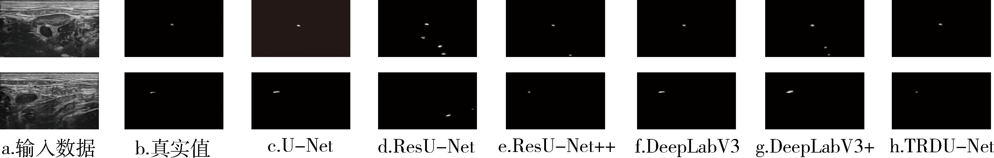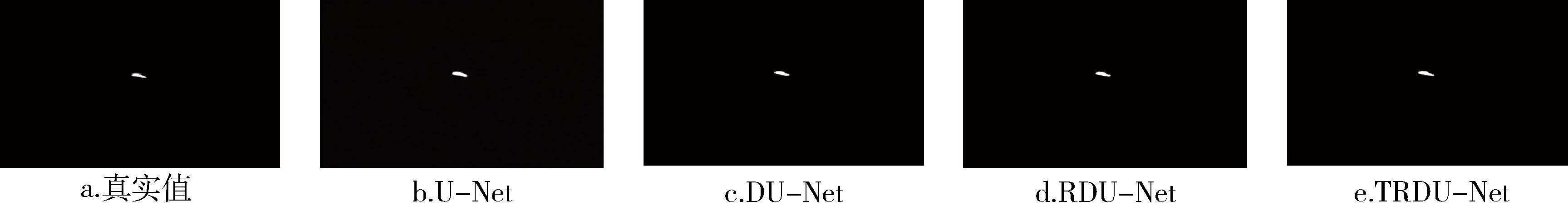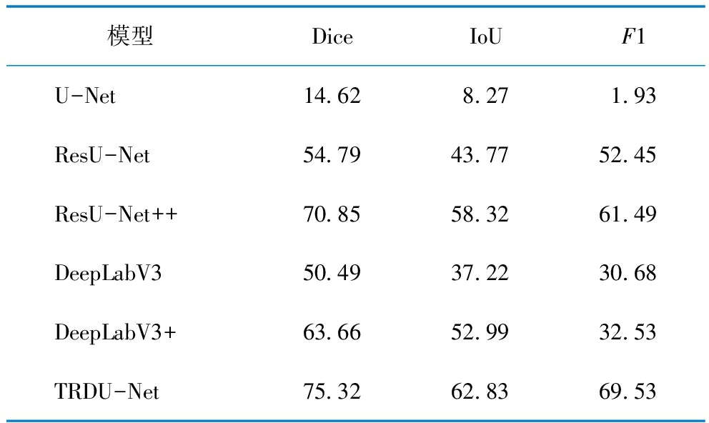 为了全面体现模型分割性能的提升,使用相同的数据和实验参数在U-Net、DeepLabV3[13]、DeepLabV3+[14]、ResU-Net[15]、ResU-Net++[16]等模型上进行对比实验,见表2。TRDU-Net模型的分割精度最高,在目标任务中的分割性能较一些通用模型有所提升。