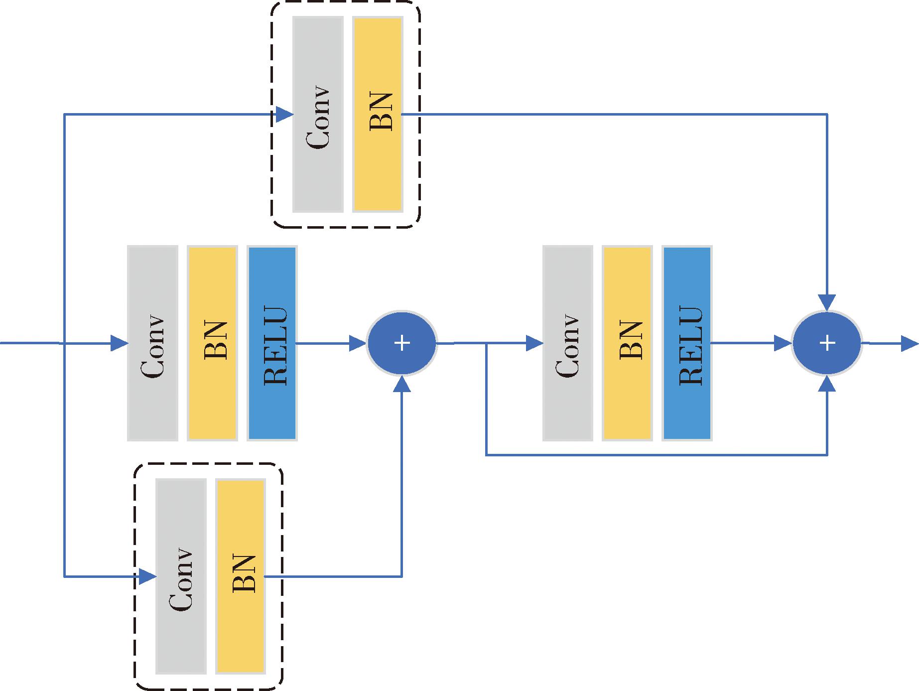 单卷积块的结构为1个卷积层(Conv)、1个批归一化层(BN)和1个ReLU激活层,卷积核大小为3×3,填充为1,步长为1。在双残差卷积块中,虚线中为进行残差处理时改变原输入特征图大小的skip块,卷积核为1×1且不进行填充,双残差卷积块通过两次卷积操作引入残差连接,从而在2个卷积层之间实现更细致的特征学习。