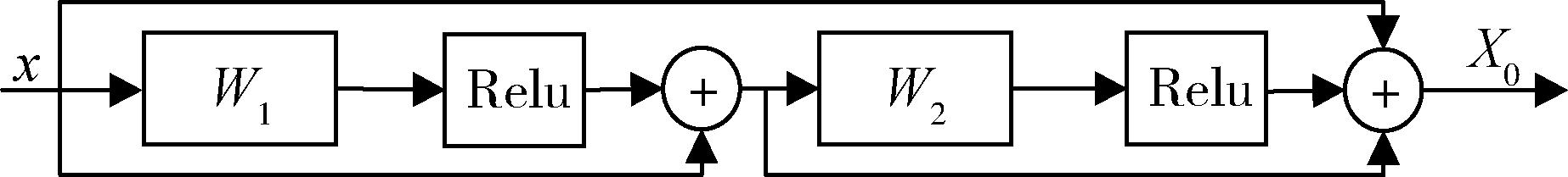 双残差卷积块结构,见图2。x为上一次计算得到的特征图,先通过一次3×3卷积W1对特征图进行线性变换,再通过ReLU函数进行激活,与输入进行相加得到中间特征图,最后经过3×3卷积W2对特征图进行线性变换并通过函数激活,将输入特征图、中间特征图和计算得到的特征图进行相加得到结果特征图x0。该结构在对卷积W1和卷积W2进行学习时,主要针对输入特征图和结果差异部分,增强对边界学习的能力。
