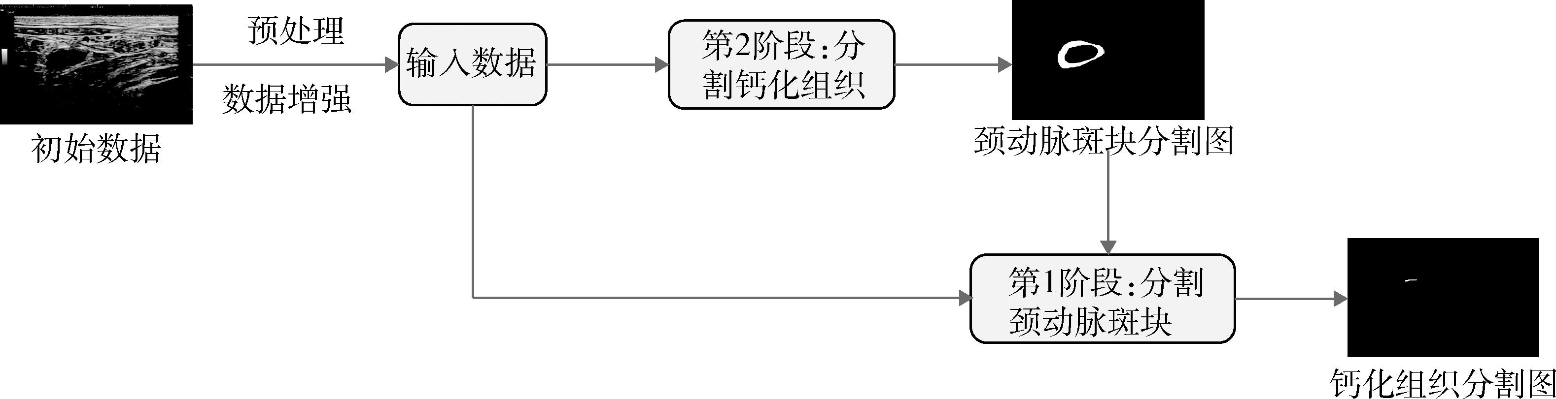 本研究使用的实验数据中,斑块内钙化组织的面积占全部图像的比例不足5%,且背景复杂,直接对钙化组织进行分割具有较高难度。因此设计分阶段的分割流程。第1阶段对颈动脉斑块进行分割,第2阶段通过增强模型对颈动脉斑块区域的注意力,实现对斑块内钙化组织的更精确分割。通过在第2阶段引入斑块的位置信息,使模型能够更有效地捕捉斑块内部的特征信息,从而在背景复杂的情况下提高分割的准确性和鲁棒性。