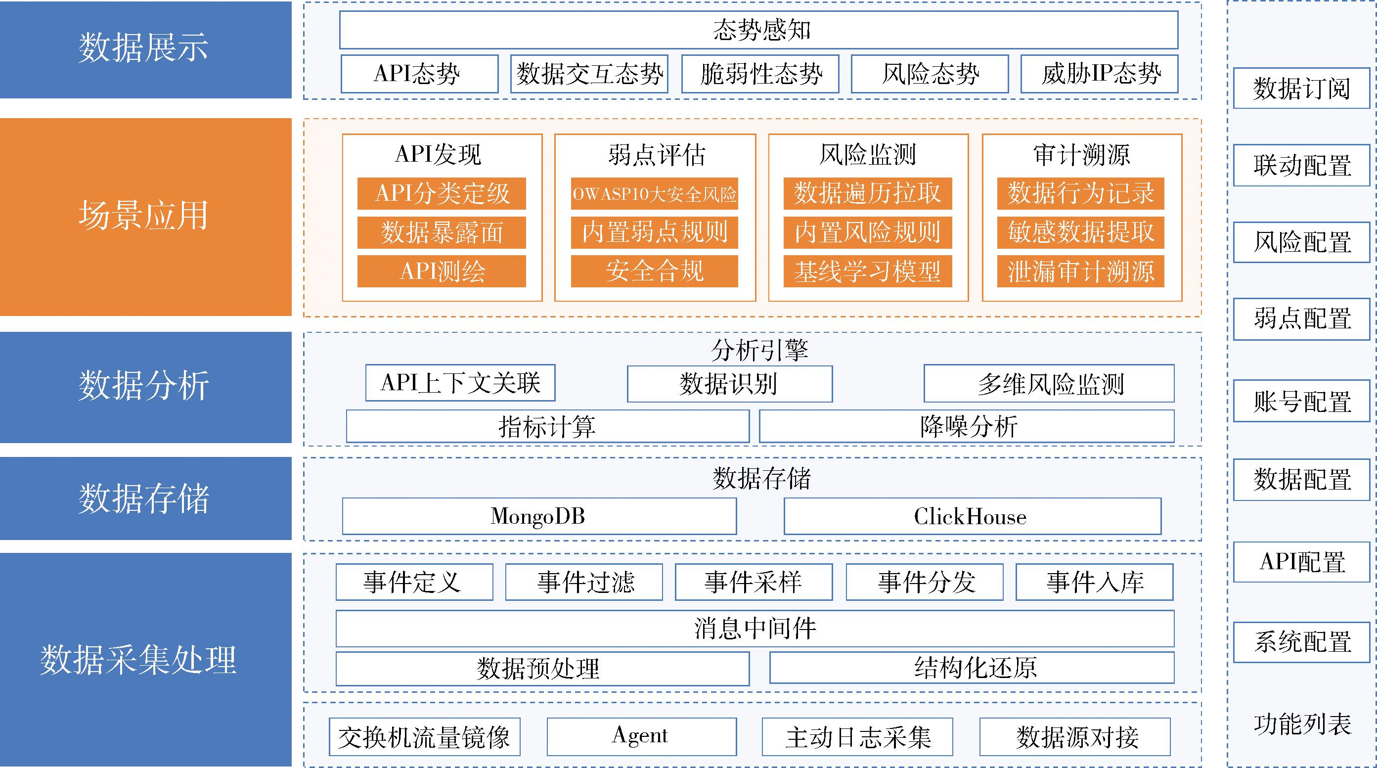 采用分层架构设计,主要包括数据采集处理层、数据存储层、数据分析层、场景应用层、数据展示层,见图1。数据采集处理层对原始流量数据进行识别、提取和规范化处理,采用对业务系统零打扰的旁路流量分析模式,通过自研中间件分发处理数据;数据存储层将系统模型配置与API数据分别存储在不同的数据库中,以加快数据处理查询速度;数据分析层服务于上层场景应用,通过数据识别、API上下文关联、多维风险监测等智能模型分析数据;场景应用层是平台识别API数据、弱点、风险及提供溯源能力的核心功能层,支持50多类数据标签、50多个弱点场景和30多个异常行为场景识别;数据展示层涵盖API态势、数据交互态势、脆弱性态势、风险态势、威胁IP态势等,实现对API安全态势的全面感知。