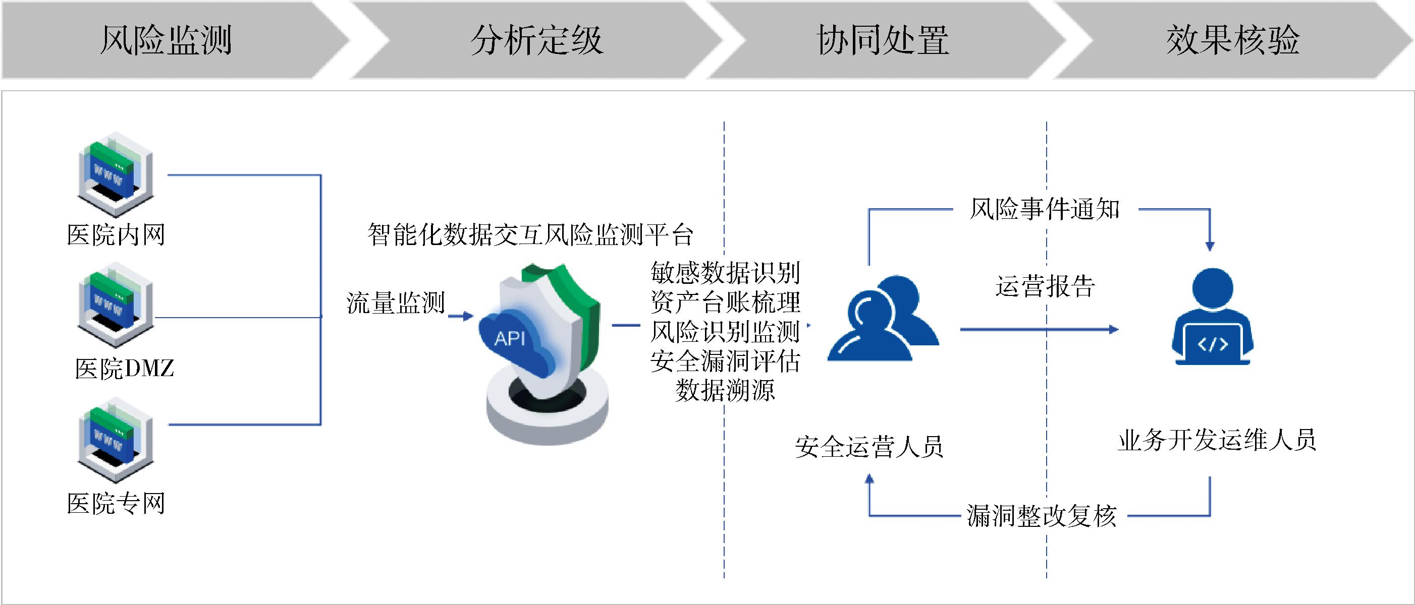 2.2.2 API数据交互安全全生命周期保障体系 依托平台监测能力,形成“风险监测-分析定级-协同处置-效果核验”完整处置链条,见图2。通过“平台智能监测+人工专业研判”协同防御模式,建立3级联动闭环处置机制,主要环节如下:一是平台实时分析系统业务流量,精准捕获数据交互风险;二是运营团队基于威胁评估矩阵对平台告警进行风险评级,确认存在安全漏洞的API并生成处置工单;三是开发运维团队依据安全基线标准修复漏洞,并将整改结果反馈给运营端复测验证。
