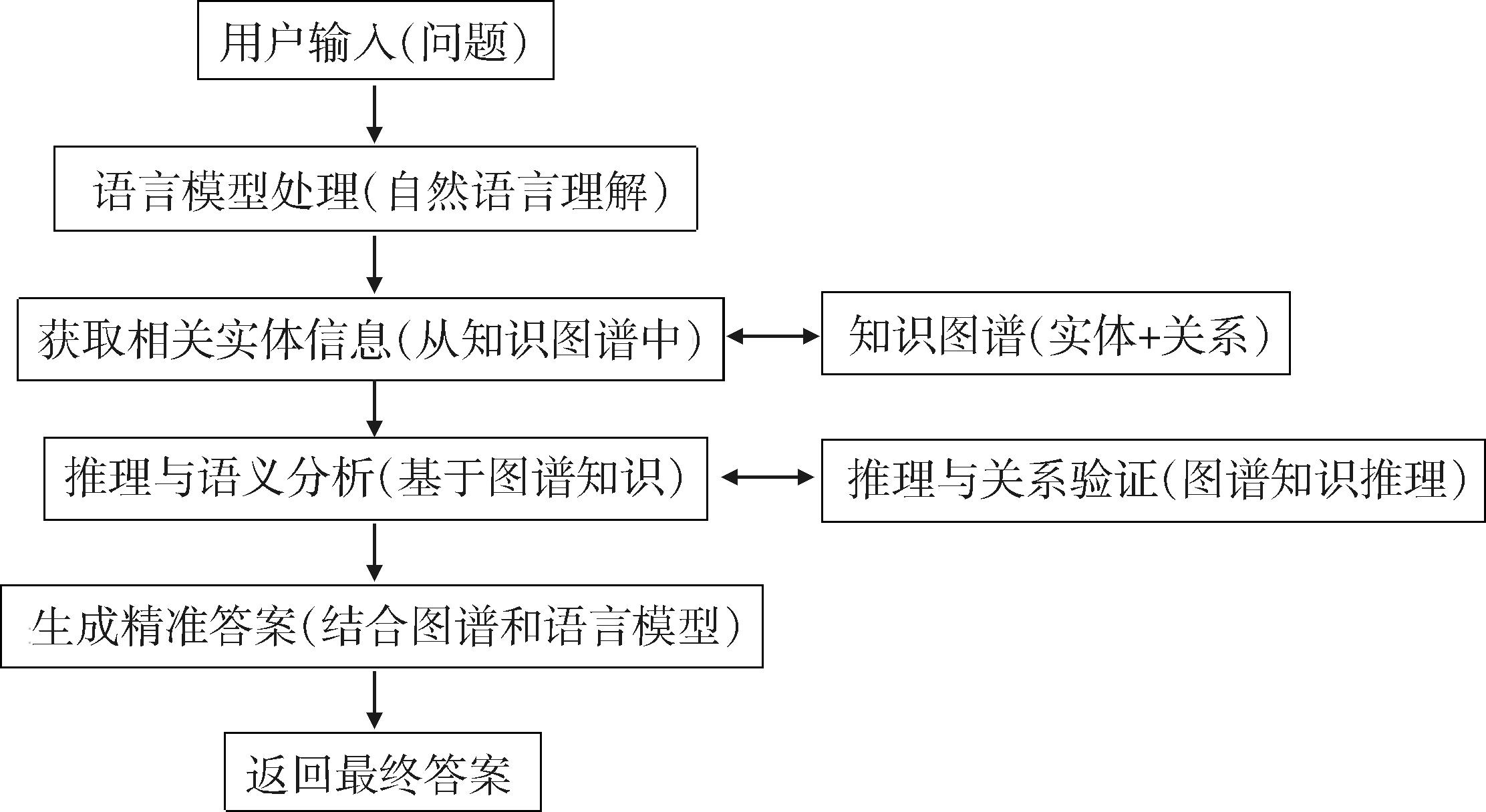 资源整合对提升信息管理效率至关重要。知识图谱[12]作为AI技术深入应用的成果,是医学图书馆资源整合的强有力工具。构建医学领域知识图谱,将文献、病例数据、研究成果等信息关联,形成结构化知识库,为科研人员提供全面、系统的医学信息资源,帮助其发掘潜在的研究机会。知识图谱增强大语言模型的工作流程,见图2。知识图谱的构建与应用,极大提升了医学图书馆知识管理能力,推动跨学科合作与信息共享,为医学研究深度发展注入动力。