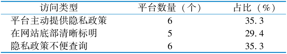 访 问 类 型 平 台 数 量 ( 个 ) 占 比 ( % ) 平 台 主 动 提 供 隐 私 政 策 6 3 5 . 3 在 网 站 底 部 清 晰 标 明 5 2 9 . 4 隐 私 政 策 不 便 查 询 6 3 5 . 3