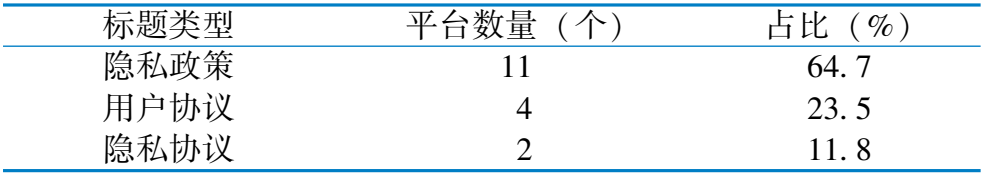 标 题 类 型 平 台 数 量 ( 个 ) 占 比 ( % ) 隐 私 政 策 1 1 6 4 . 7 用 户 协 议 4 2 3 . 5 隐 私 协 议 2 1 1 . 8