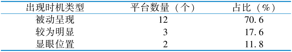 出 现 时 机 类 型 平 台 数 量 ( 个 ) 占 比 ( % ) 被 动 呈 现 1 2 7 0 . 6 较 为 明 显 3 1 7 . 6 显 眼 位 置 2 1 1 . 8