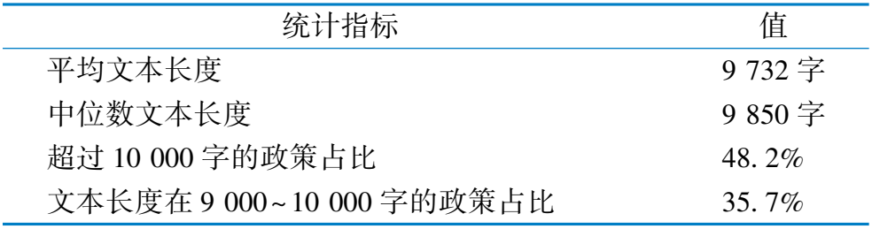 统计指标 值 平均文本长度 9 732 字 中位数文本长度 9 850 字 超过 10 000 字的政策占比 48. 2% 文本长度在 9 000~ 10 000 字的政策占比 35. 7%