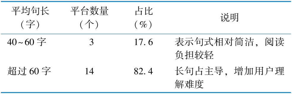 平 均 句 长 ( 字 ) 平 台 数 量 ( 个 ) 占 比 ( % ) 说 明 4 0 ~ 6 0 字 3 1 7 . 6 表 示 句 式 相 对 简 洁 , 阅 读 负 担 较 轻 超 过 6 0 字 1 4 8 2 . 4 长 句 占 主 导 , 增 加 用 户 理 解 难 度