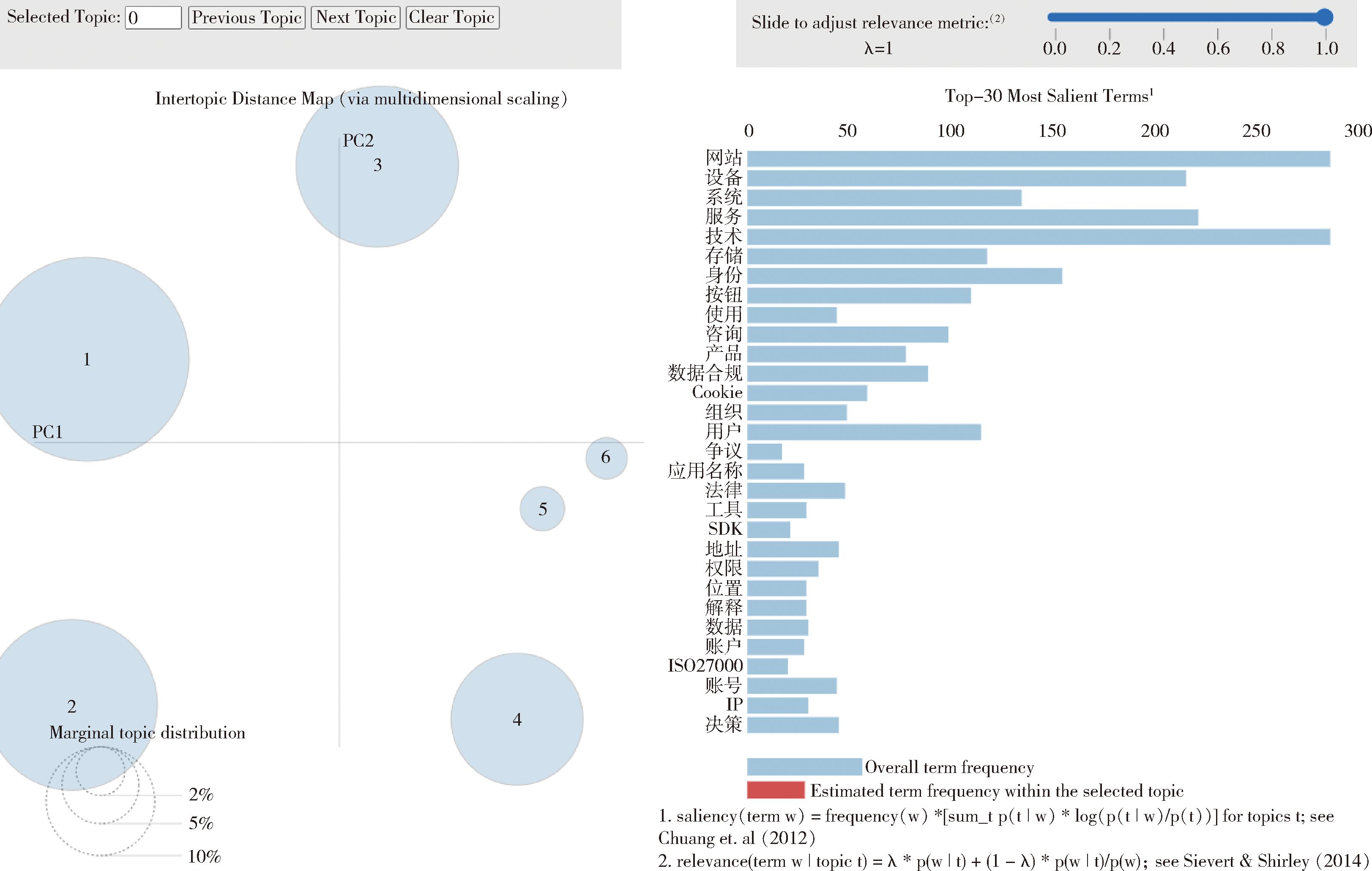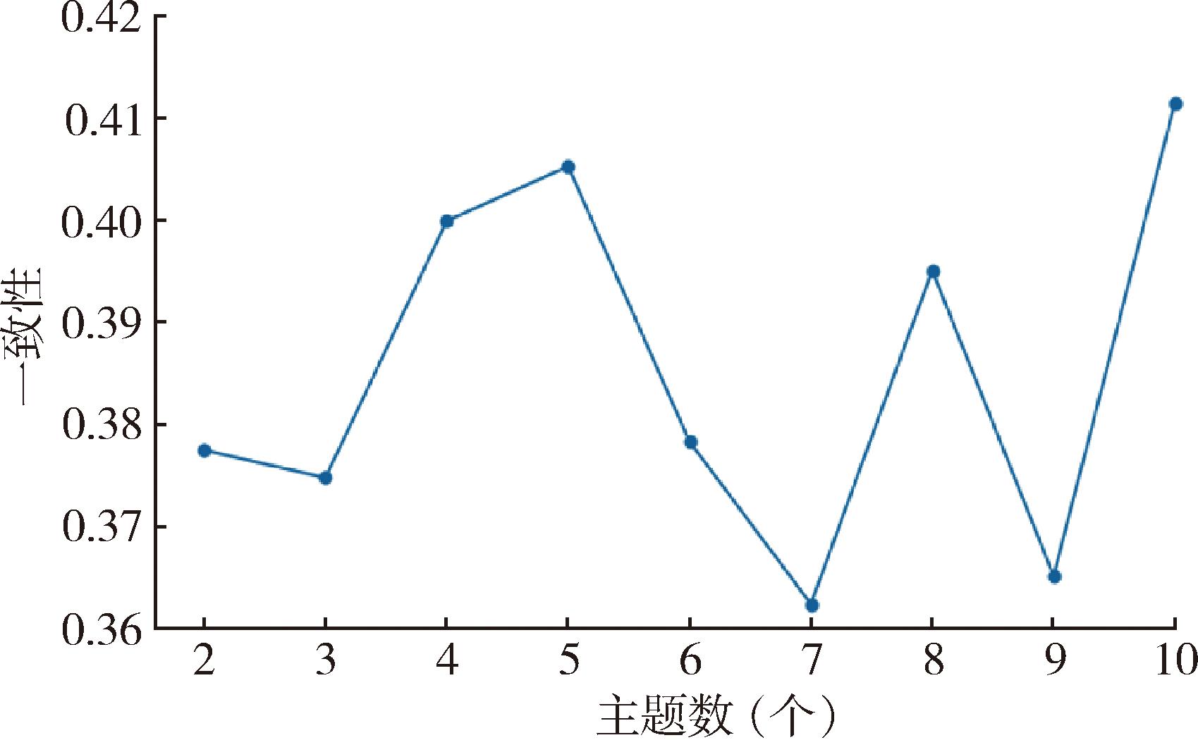 3.2.1 隐私政策主体提取 为确定最优主题数,以主题数2—10为范围训练LDA模型,并计算每个主题数下的困惑度与一致性得分。困惑度衡量模型对语料的拟合能力,困惑度越低,表示模型越能有效拟合数据。一致性衡量主题词间的语义连贯性,一致性越高,主题的质量越好。不同主题数的困惑度变化趋势,见图1。困惑度在不同主题数下波动较大,整体未呈单调下降趋势,说明主题数的增减对模型拟合性能影响较敏感;其中主题数为6时困惑度出现显著降低,表明模型对文本的拟合能力较强。不同主题数的一致性得分分布,见图2。一致性得分在第6个主题附近虽未达到最大值,但表现出良好的语义连贯性,且波动较小,有利于主题的稳定识别。健康信息平台隐私政策主题可视化,见图3。综合困惑度与一致性两方面的评价结果,最终将隐私政策的最优主题数确定为6个。
