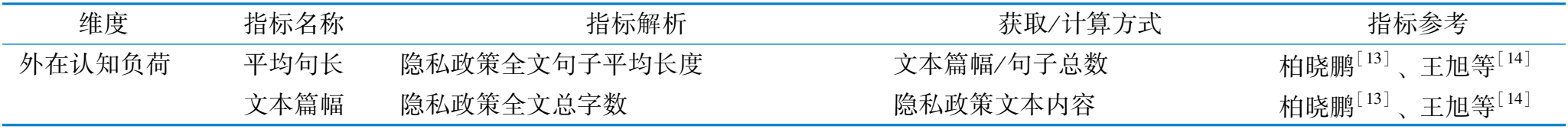 维 度 指 标 名 称 指 标 解 析 获 取 / 计 算 方 式 指 标 参 考 外 在 认 知 负 荷 平 均 句 长 隐 私 政 策 全 文 句 子 平 均 长 度 文 本 篇 幅 / 句 子 总 数 柏 晓 鹏 [ 1 3 ] 、 王 旭 等 [ 1 4 ] 文 本 篇 幅 隐 私 政 策 全 文 总 字 数 隐 私 政 策 文 本 内 容 柏 晓 鹏 [ 1 3 ] 、 王 旭 等 [ 1 4 ]