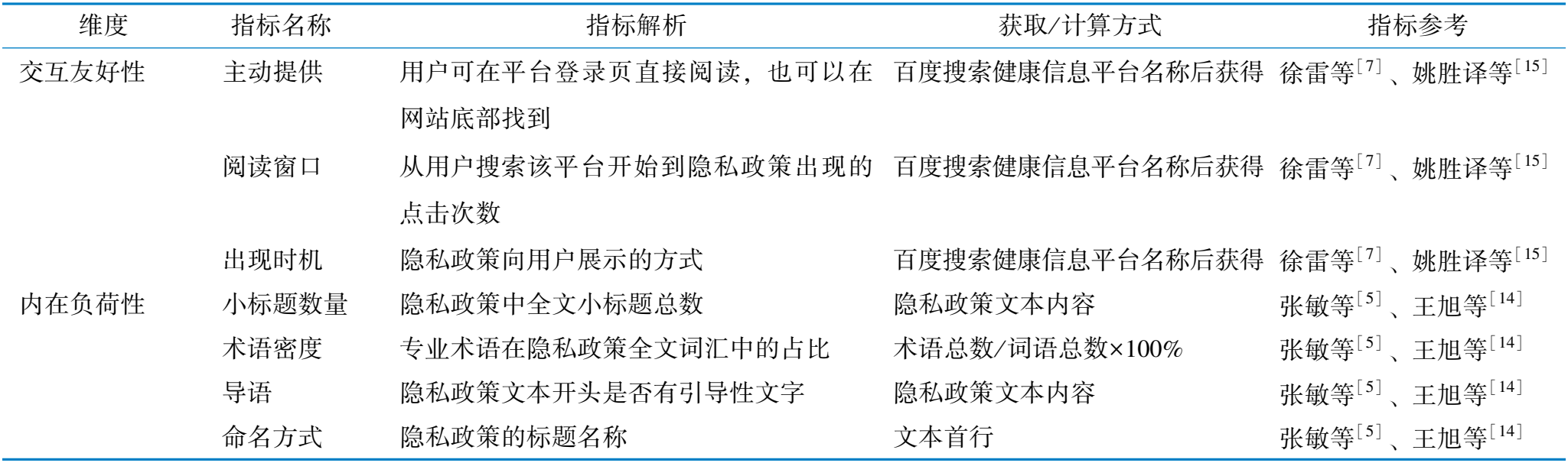 维度 指标名称 指标解析 获取/ 计算方式 指标参考 交互友好性 主动提供 用户可在平台登录页直接阅读, 也可以在 网站底部找到 百度搜索健康信息平台名称后获得 徐雷等[7] 、 姚胜译等[15] 阅读窗口 从用户搜索该平台开始到隐私政策出现的 点击次数 百度搜索健康信息平台名称后获得 徐雷等[7] 、 姚胜译等[15] 出现时机 隐私政策向用户展示的方式 百度搜索健康信息平台名称后获得 徐雷等[7] 、 姚胜译等[15] 内在负荷性 小标题数量 隐私政策中全文小标题总数 隐私政策文本内容 张敏等[5] 、 王旭等[14] 术语密度 专业术语在隐私政策全文词汇中的占比 术语总数/ 词语总数×100% 张敏等[5] 、 王旭等[14] 导语 隐私政策文本开头是否有引导性文字 隐私政策文本内容 张敏等[5] 、 王旭等[14] 命名方式 隐私政策的标题名称 文本首行 张敏等[5] 、 王旭等[14]