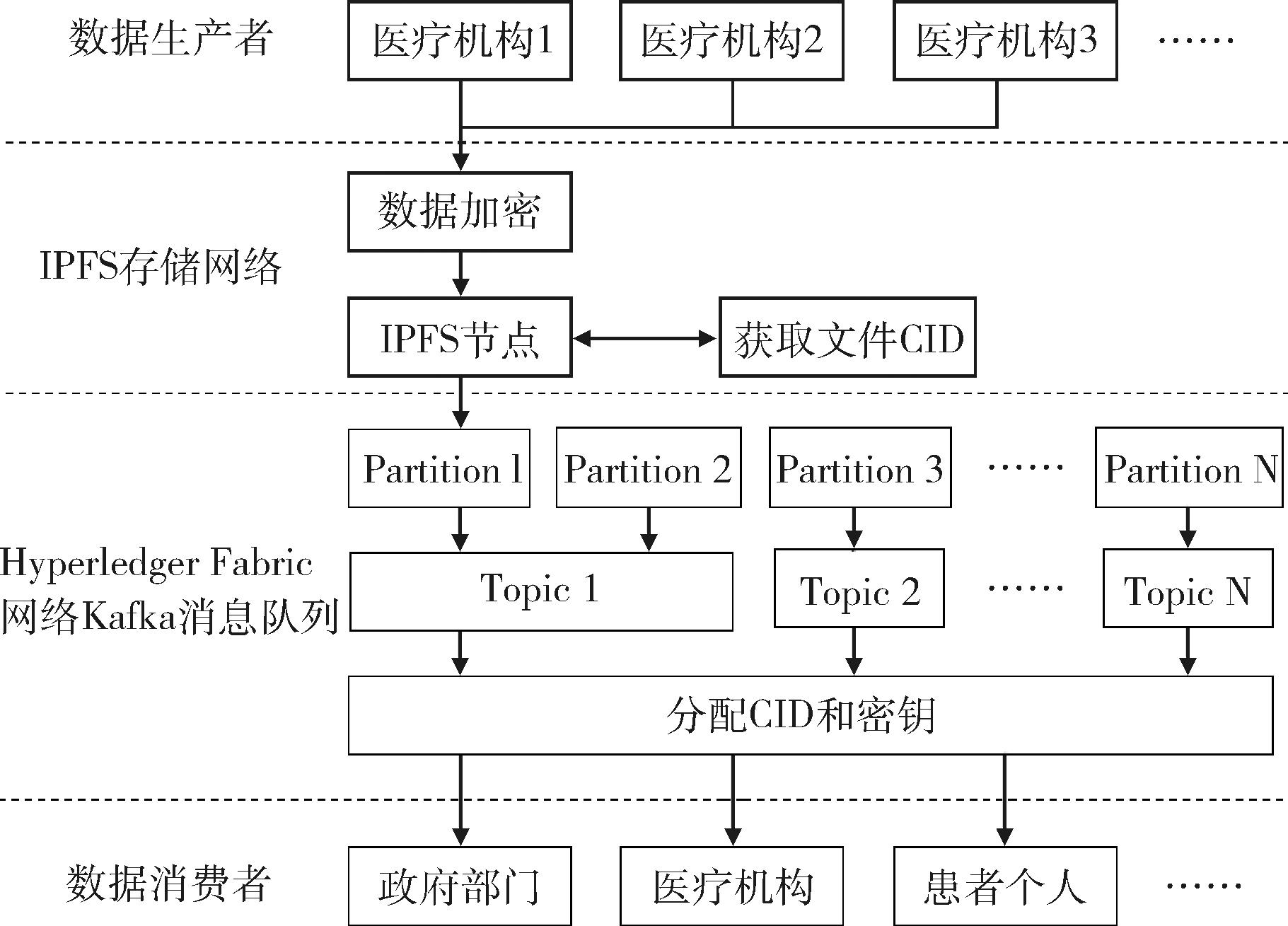 4.3.2 采用轻量化区块链存证技术 轻量化区块链存证技术[14]是保障医疗数据安全与可追溯性的关键手段。该技术结合Hyperledger Fabric的Kafka共识机制与星际文件系统(interplanetary file system,IPFS)的内容标识符(content identifier,CID)存储方案,构建高效可靠的存证体系,见图2。当医疗机构向区块链网络提交医疗数据存证请求时,这些请求会被打包成交易消息发送至Kafka消息队列,网络中各节点从队列中获取消息,并按照特定顺序处理,保证所有节点对数据存证的处理顺序一致,从而实现共识。Kafka具有高可靠性和容错性,即使部分节点出现故障,消息也不会丢失,保障了区块链网络的稳定性。在IPFS网络中,每个文件或数据块均被赋予唯一CID。CID是根据文件内容通过加密算法生成的,这意味着只要文件内容不变,其CID就不会改变。当医疗数据存储到IPFS网络时,数据会被分割成多个数据块,并分散存储在多个节点上,而不是集中存储于少数服务器,以降低存储成本,提高数据可靠性。同时,通过CID可以快速定位和检索数据,提高数据访问效率。
