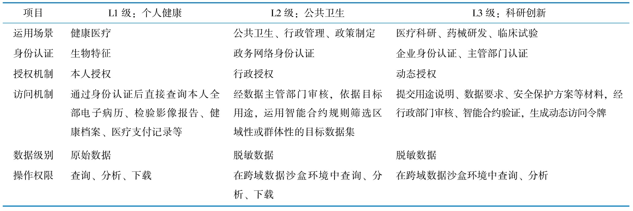 4.2.3 数据分级授权机制 参照“欧洲健康数据空间”双轨管理机制,结合长三角区域协同背景,明确个人健康、公共卫生、科研创新3级场景的访问机制及操作权限等,见表3。基于轻量化区块链存证技术,根据用户、环境和数据属性,动态决策数据访问及使用权限,保障个人对其健康数据的主权、使用权和控制权。对于个人健康医疗场景,通过生物特征认证方式,开放全面、详细、精准、及时的数据权限,并以此为基础延伸就医治疗、医保结算、慢病管理等全生命周期服务;对于公共卫生、行政管理或政策制定场景,通过政务网络身份认证方式,开放跨域数据沙盒环境,运用智能合约规则库筛选脱敏后的目标数据集,对于特殊用途的权限升级要求,须经区域性医疗数据伦理审查委员会审查同意;对于医疗科研、药械研发、临床试验场景,须提交明确的用途说明、数据要求、安全保护方案等材料,经智能合约验证申请合规性,生成动态访问令牌,在跨域数据沙盒环境进行隔离计算,计算结果经隐私处理后输出,对于特殊用途的权限升级要求,须经区域性医疗数据伦理审查委员会与数据权人“双授权”。