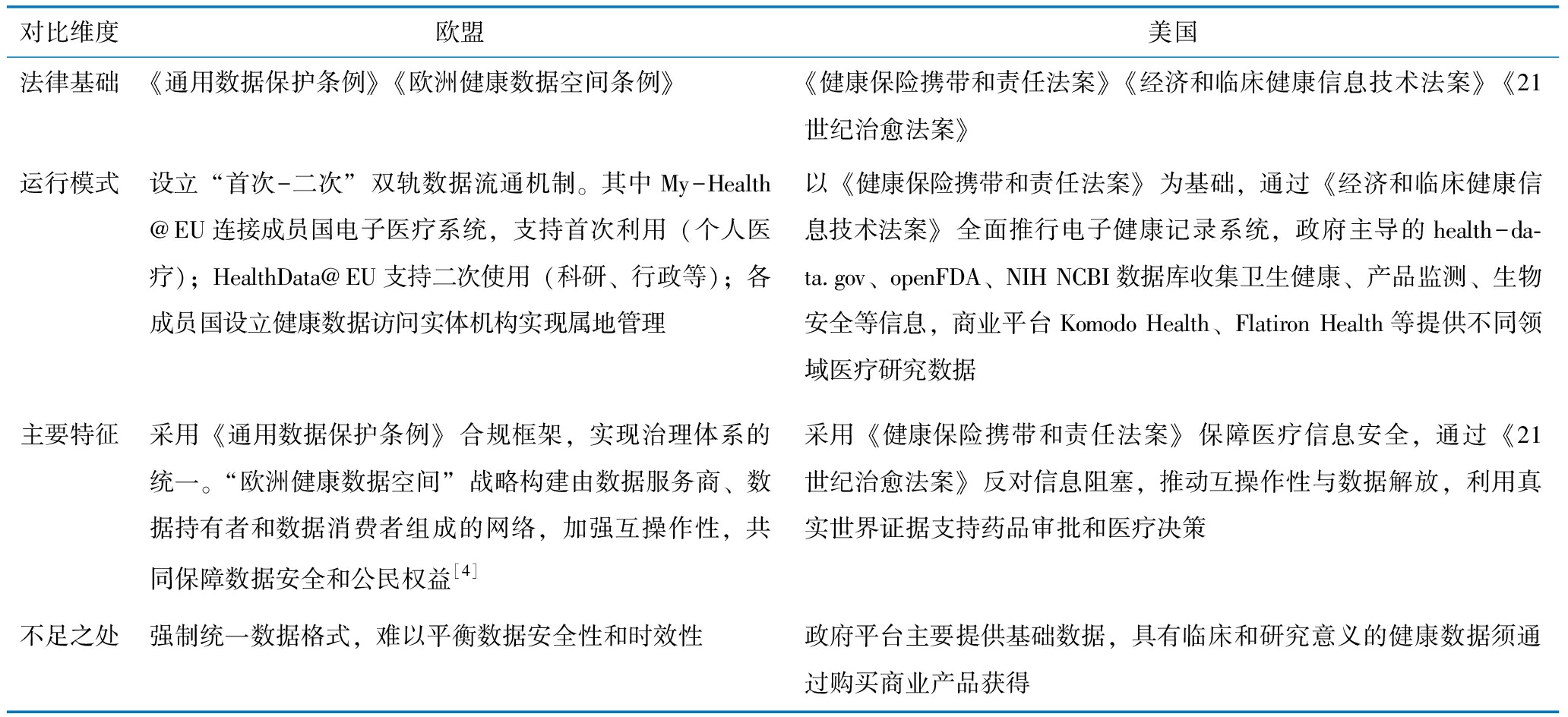 对比维度欧盟美国法律基础《通用数据保护条例》《欧洲健康数据空间条例》《健康保险携带和责任法案》《经济和临床健康信息技术法案》《21世纪治愈法案》运行模式设立“首次-二次”双轨数据流通机制。其中My-Health@EU连接成员国电子医疗系统,支持首次利用(个人医疗);HealthData@EU支持二次使用(科研、行政等);各成员国设立健康数据访问实体机构实现属地管理以《健康保险携带和责任法案》为基础,通过《经济和临床健康信息技术法案》全面推行电子健康记录系统,政府主导的health-da-ta.gov、openFDA、NIH NCBI数据库收集卫生健康、产品监测、生物安全等信息,商业平台Komodo Health、Flatiron Health等提供不同领域医疗研究数据主要特征采用《通用数据保护条例》合规框架,实现治理体系的统一。“欧洲健康数据空间”战略构建由数据服务商、数据持有者和数据消费者组成的网络,加强互操作性,共同保障数据安全和公民权益[4]采用《健康保险携带和责任法案》保障医疗信息安全,通过《21世纪治愈法案》反对信息阻塞,推动互操作性与数据解放,利用真实世界证据支持药品审批和医疗决策不足之处强制统一数据格式,难以平衡数据安全性和时效性政府平台主要提供基础数据,具有临床和研究意义的健康数据须通过购买商业产品获得