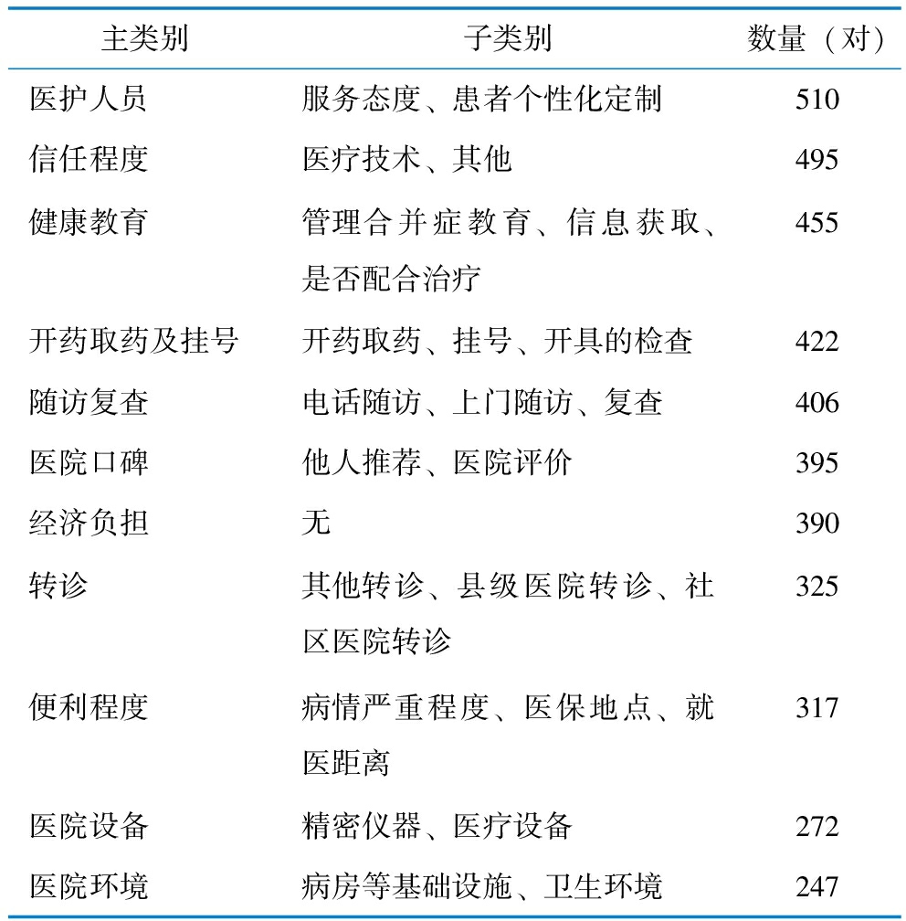 主类别子类别数量(对)医护人员服务态度、患者个性化定制510信任程度医疗技术、其他495健康教育管理合并症教育、信息获取、是否配合治疗455开药取药及挂号开药取药、挂号、开具的检查422随访复查电话随访、上门随访、复查406医院口碑他人推荐、医院评价395经济负担无390转诊其他转诊、县级医院转诊、社区医院转诊325便利程度病情严重程度、医保地点、就医距离317医院设备精密仪器、医疗设备272医院环境病房等基础设施、卫生环境247