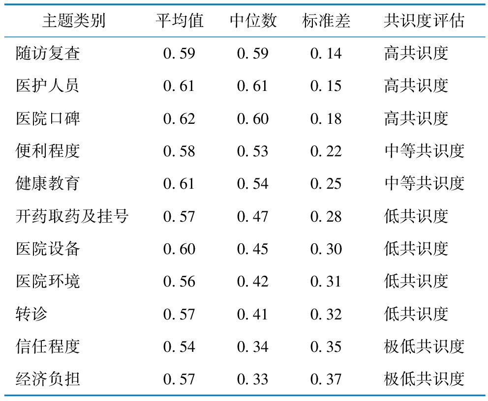 主题类别平均值中位数标准差共识度评估随访复查0.590.590.14高共识度 医护人员0.610.610.15高共识度 医院口碑0.620.600.18高共识度 便利程度0.580.530.22中等共识度健康教育0.610.540.25中等共识度开药取药及挂号0.570.470.28低共识度 医院设备0.600.450.30低共识度 医院环境0.560.420.31低共识度 转诊0.570.410.32低共识度 信任程度0.540.340.35极低共识度经济负担0.570.330.37极低共识度