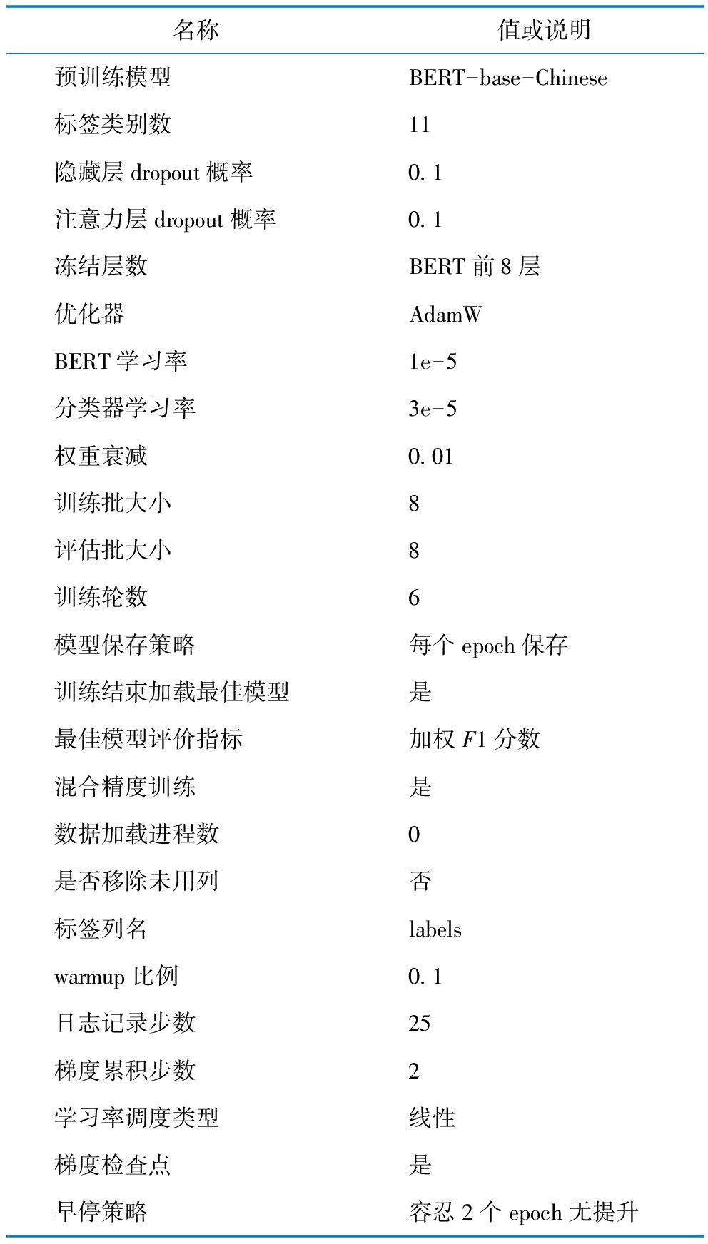 名称值或说明预训练模型BERT-base-Chinese标签类别数11隐藏层dropout概率0.1注意力层dropout概率0.1冻结层数BERT前8层优化器AdamWBERT学习率1e-5分类器学习率3e-5权重衰减0.01训练批大小8评估批大小8训练轮数6模型保存策略每个epoch保存训练结束加载最佳模型是最佳模型评价指标加权F1分数混合精度训练是数据加载进程数0是否移除未用列否标签列名labelswarmup比例0.1日志记录步数25梯度累积步数2学习率调度类型线性梯度检查点是早停策略容忍2个epoch无提升