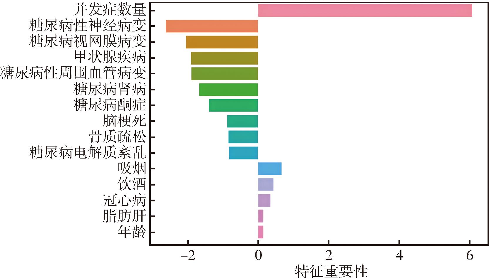 特征系数可量化特征在模型中的重要性,其正负和绝对值反映特征与共病发生概率的相关性。相关性最高的3个特征依次为:并发症数量、糖尿病性神经病变、糖尿病视网膜病变。并发症数量指除T2DM与高血压之外,患者所患其他并发症的数量总和。