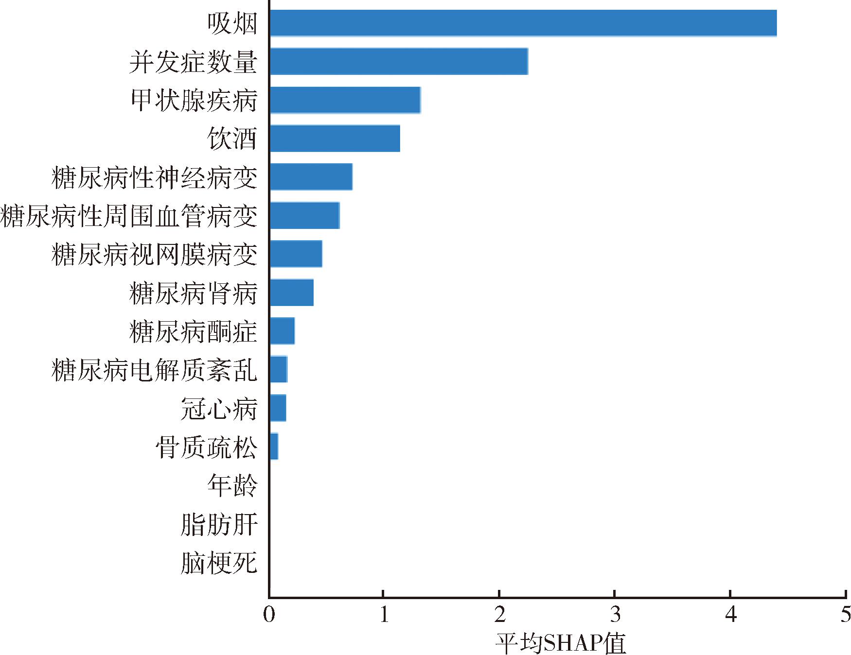 T2DM、高血压等慢性疾病是公共卫生领域的重大挑战[15]。由于不同病种间存在共同的致病因素,共病现象日益普遍[16]。我国现有诊疗指南多针对单一病种,针对共病的相对较少。共病不仅增加了治疗复杂性,还可引发过度治疗。因此,早期识别T2DM合并高血压的危险因素,并实施前瞻性防控尤为必要。从共病机制看,T2DM合并高血压的病理关联涉及多方面因素,研究[17-18]表明,T2DM患者持续高血糖可促进内皮细胞下胶原交联、加剧血管壁纤维化,而此病理变化正是高血压发生的重要机制之一。临床研究发现,约75%的T2DM患者同时患有高血压[19]。医疗负担方面,这种病理上的共存不仅加剧了患者的整体健康风险,显著提高心血管事件发生的概率[1,20],还会通过交互作用导致更严重的健康后果[21]。此外,该共病状态会加重患者经济负担与医疗资源消耗,表现为治疗成本增加及院内死亡率上升[1]。
