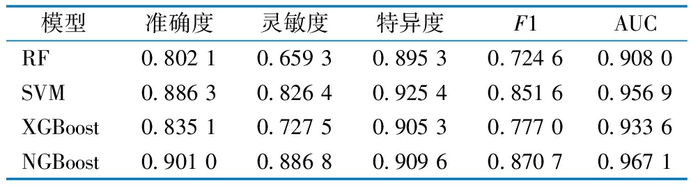 模型准确度灵敏度特异度F1AUCRF0.802 10.659 30.895 30.724 60.908 0SVM0.886 30.826 40.925 40.851 60.956 9XGBoost0.835 10.727 50.905 30.777 00.933 6NGBoost0.901 00.886 80.909 60.870 70.967 1