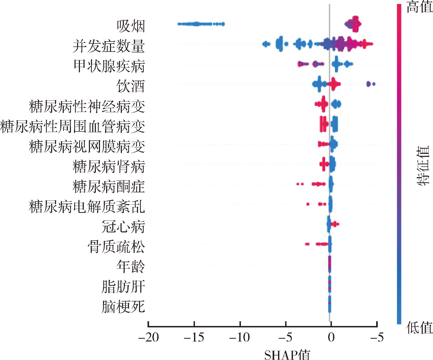 采用SHAP解释性分析进一步探究T2DM与高血压共病的影响因素及其交互作用。基于平均SHAP值排序的重要特征条形图,见图2。平均SHAP值反映特征对模型输出影响的大小,值越大影响越显著。结果显示,吸烟的SHAP值最高,对共病影响起关键性作用;其次是并发症数量和甲状腺疾病,两者显著提升共病风险;饮酒、糖尿病性神经病变、糖尿病性周围血管病变SHAP值也较高,证实其在共病中的重要作用。以散点图进一步细化特征排序并阐释变量对结果的具体影响,见图3。Y轴按照各特征对模型预测贡献大小由上到下依次排列,X轴的SHAP值表示特征取值对预测结果的影响方向与程度,正值表示该特征会使共病概率上升,负值则相反;颜色表示特征值高低。吸烟、并发症数量对共病发生的影响较显著,说明吸烟或并发症数量越多的个体,在一定程度上共病形成的可能性越大;而脂肪肝、脑梗死等位于图底部的特征,SHAP值较低,对模型预测贡献较小。