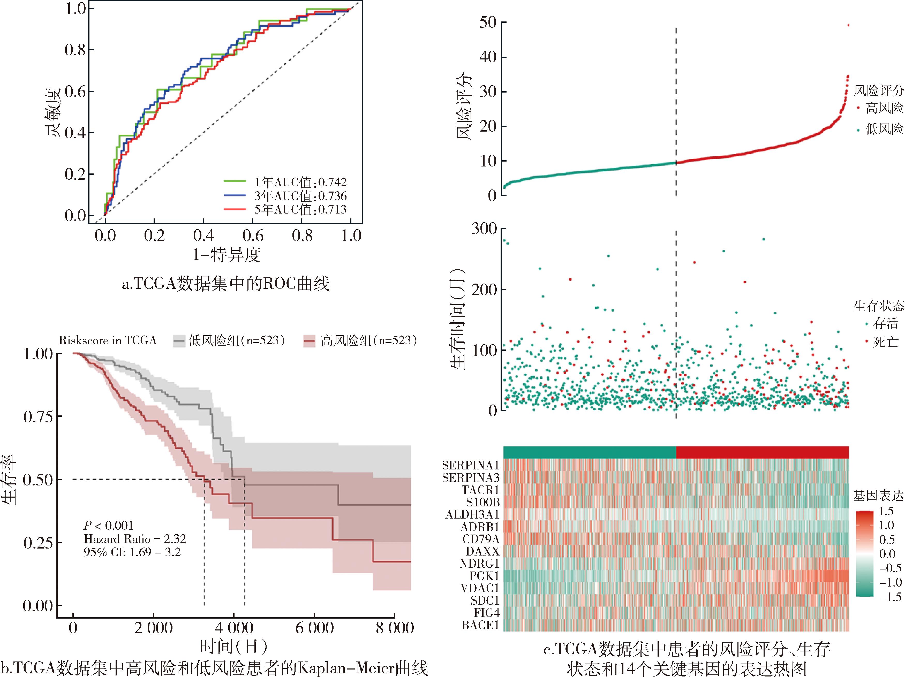以TCGA队列为训练集,GSE96058和GSE20685为验证集,通过Mime1包构建117种机器学习模型。其中,StepCox[forward]-Lasso组合模型在训练集与验证集3个队列中均表现最佳,C-index平均值分别为0.71、0.65和0.65;预测1年生存率的AUC值也最优,分别为0.76、0.73和0.76,表明模型性能良好。基于该模型的中位风险评分将患者分为高、低风险组,最终模型由PGK1、VDAC1、FIG4、BACE1、SDC1、NDRG1、TACR1、S100B、CD79A、SERPINA3、SERPINA1、ADRB1、ALDH3A1及DAXX共14个基因及其相应系数组成。