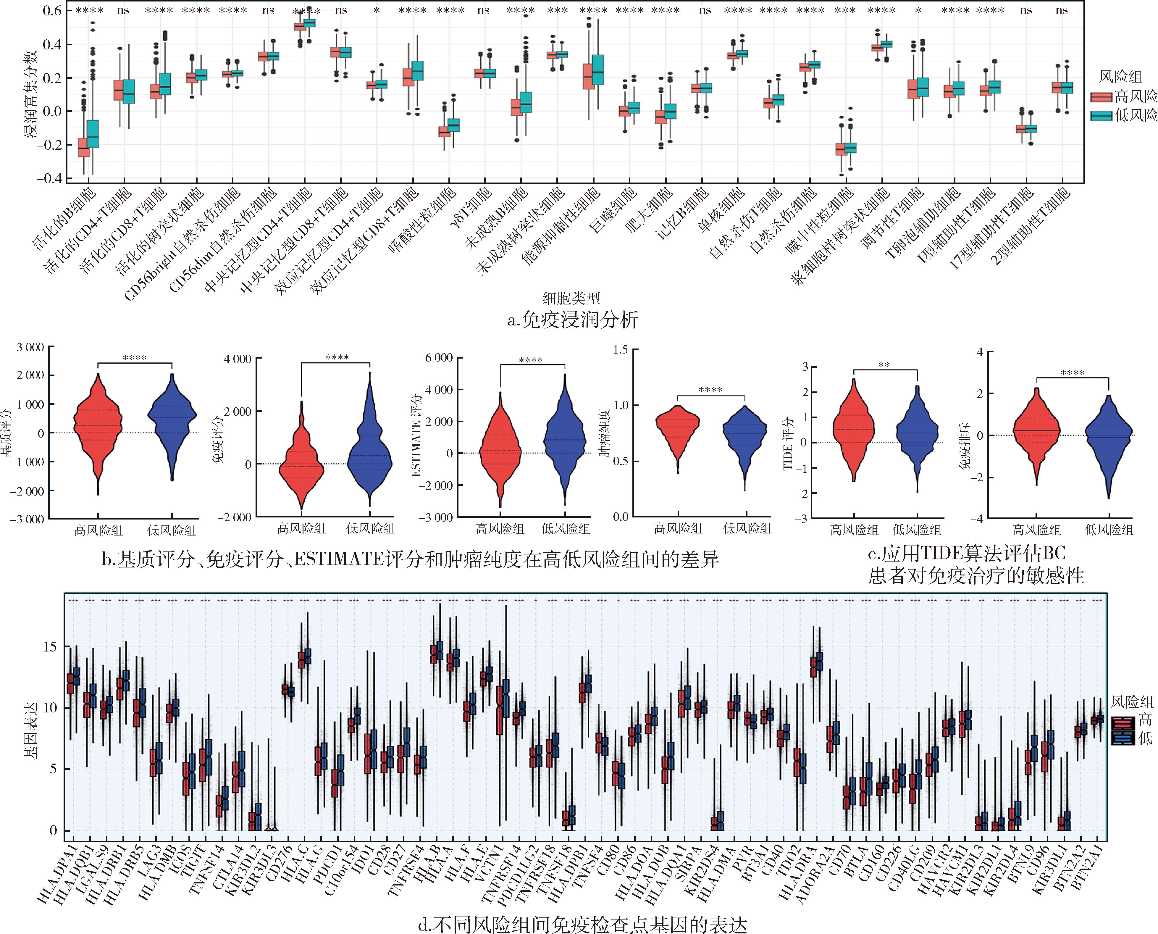 使用R语言ssGSEA包计算28个免疫细胞在高低风险组之间的免疫浸润差异。使用ESTIMATE包计算免疫细胞富集得分、免疫评分和肿瘤纯度。继而通过limma包检测高低风险组间免疫检查点相关基因表达水平的差异。最后利用TIDE评分算法(http://tide.dfci.harvard.edu/)评估不同风险组之间免疫治疗反应的差异。