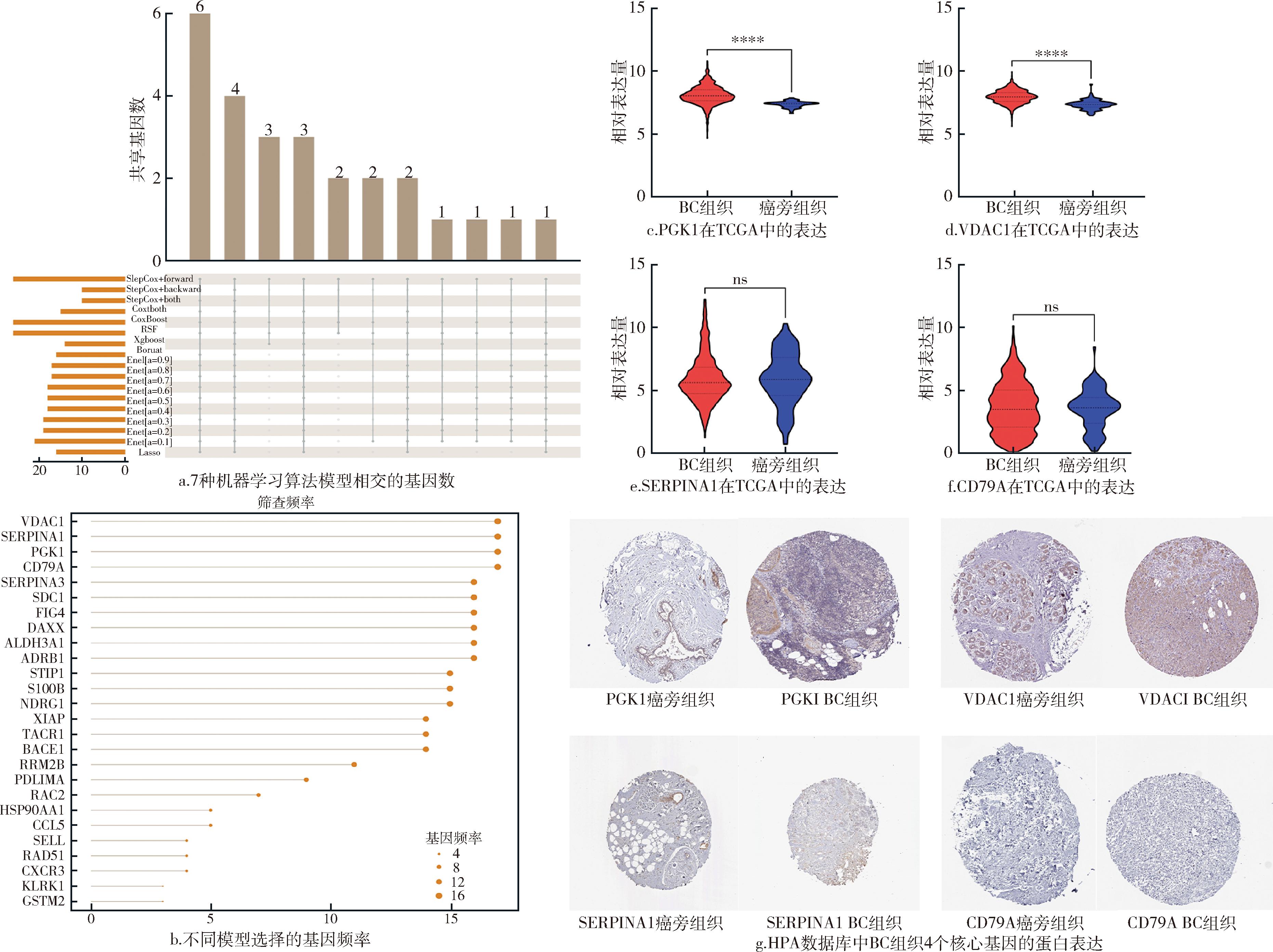为深入鉴定关键基因,采用7种机器学习算法对TCGA队列进行特征筛选,最终确定4个核心基因(VDAC1、SERPINA1、PGK1和CD79A)用于后续分析,见图9a—图9b。随后,利用不同数据库对上述核心基因的表达水平进行多层次验证:利用TCGA与GTEx数据集比较其mRNA的差异表达情况,并结合HPA数据库进一步验证其蛋白质水平的表达情况。TCGA数据分析显示,PGK1与VDAC1在BC组织中表达显著上调,见图9c—图9d,而SERPINA1与CD79A在两组间的表达差异无统计学意义,见图9e—图9f。HPA数据库验证显示,PGK1与VDAC1在BC组织中蛋白水平呈现高表达,而SERPINA1与CD79A的蛋白水平均无显著差异,与其mRNA表达结果相符,见图9g。