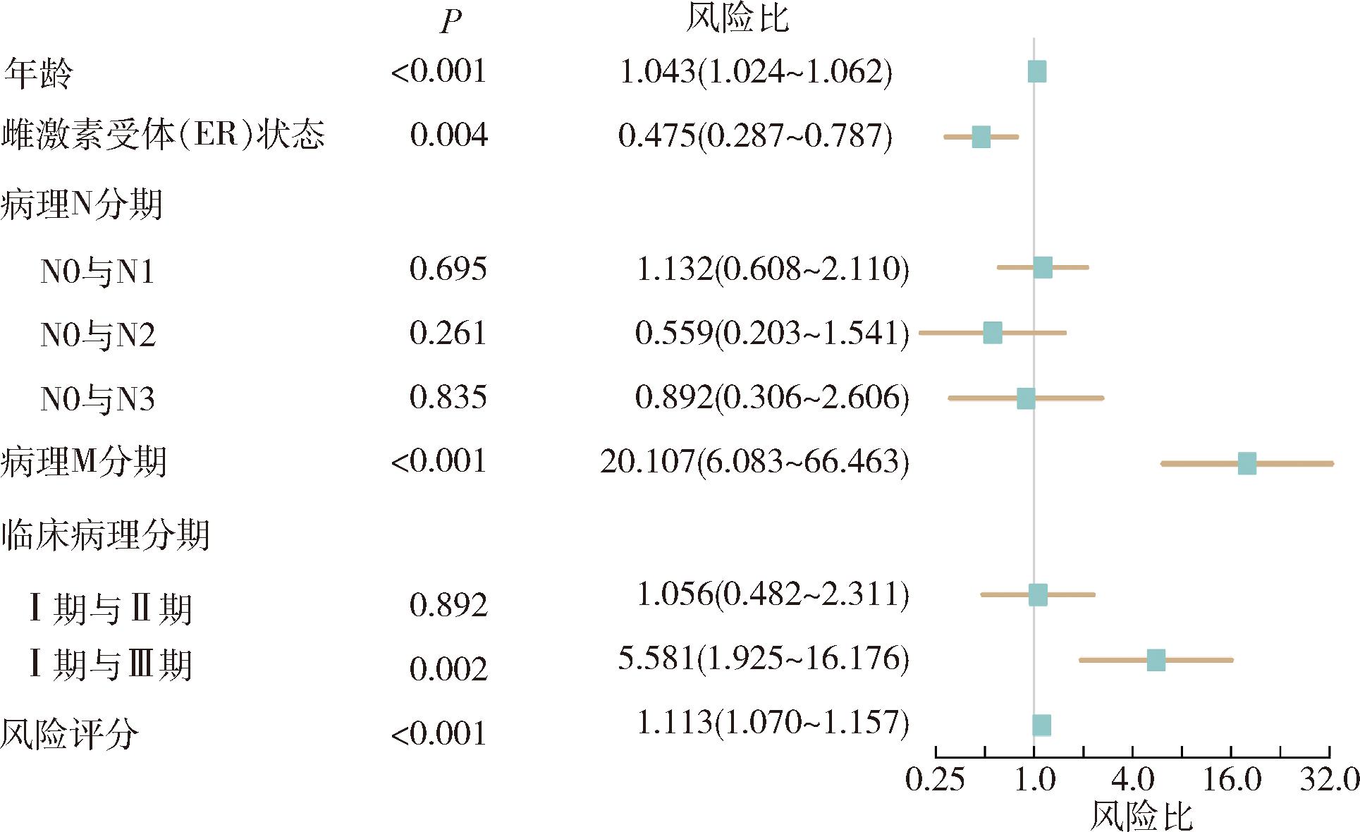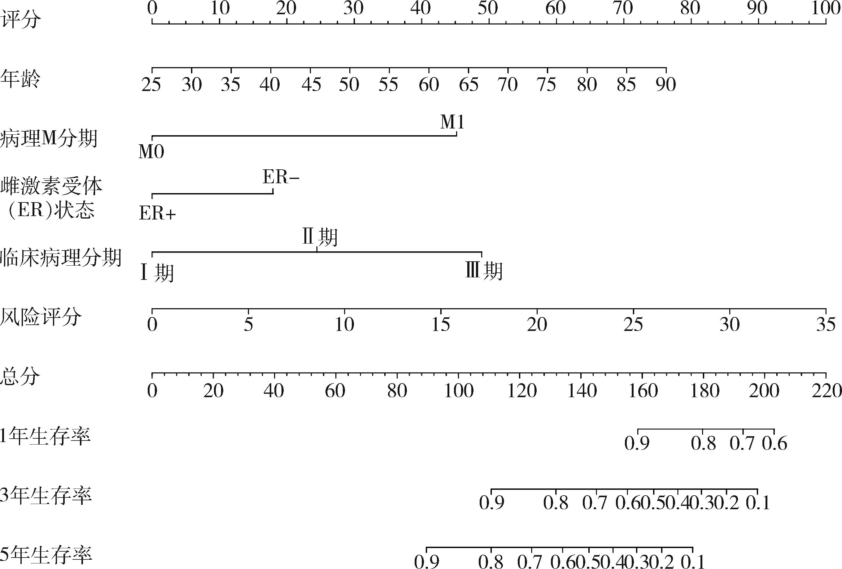 图4 结合年龄、ER状态、病理M分期、临床分期与风险评分的列线图