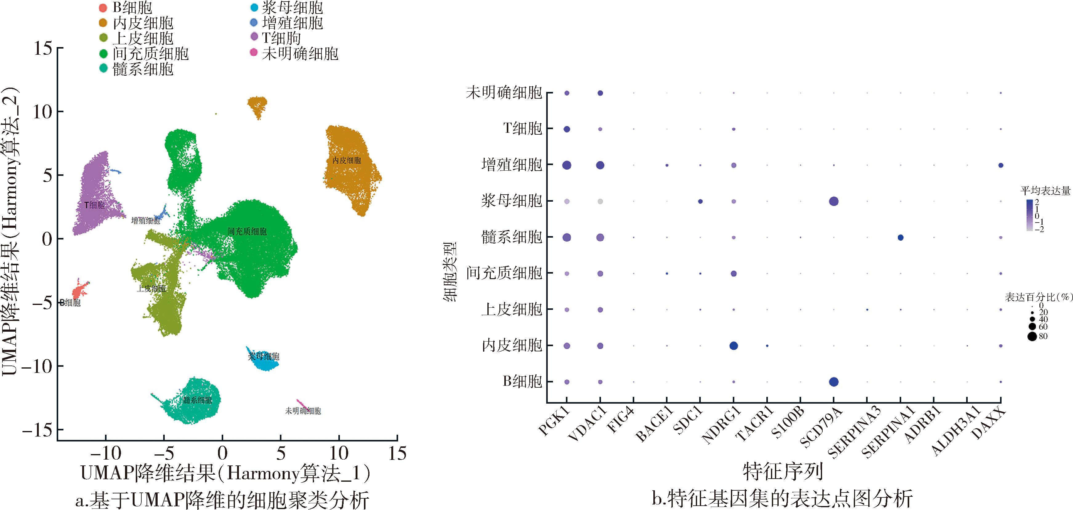 基于单细胞数据集采用Louvain算法进行细胞聚类,并通过UMAP可视化聚类分布,见图8a。不同细胞类型在二维空间形成明显独立的细胞簇,表明各细胞群体在基因表达层面存在显著差异,聚类效果良好。基因表达点图证实14个特征基因在不同细胞亚群中的表达存在明确差异性,见图8b。其中,CD79A基因在B细胞群中特异性高表达,表现为较高的表达水平和表达比例。PGK1与VDAC1基因在上皮细胞和增殖细胞群体中表达最为显著,其余基因(如SERPINA1等)在髓系细胞和间充质细胞中呈现不同程度表达。