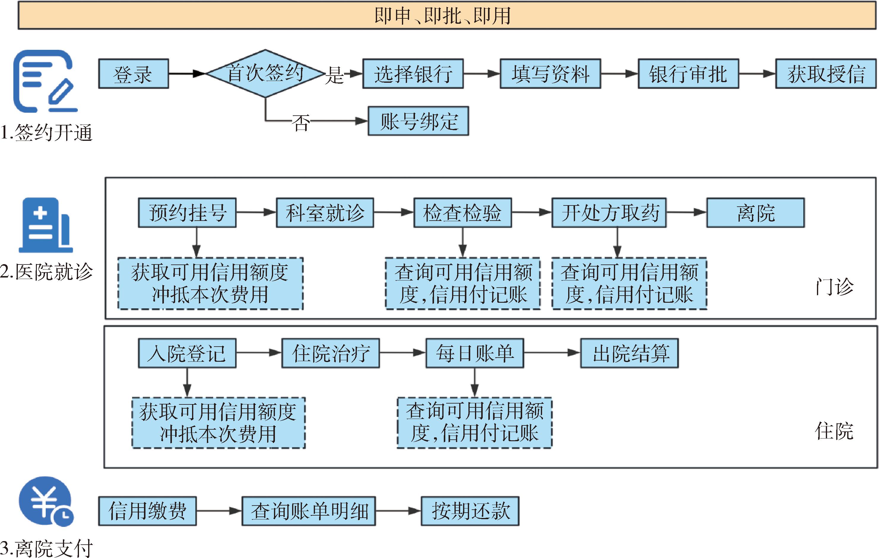 “先诊疗后付费”信用就医流程,见图2。首先,签约开通信用就医,患者可通过线上或线下渠道,向合作银行申请信用就医额度,银行依据信用就医平台计算出的信用额度进行授信,确定信用额度。其次,在门诊就诊环节,患者选择信用就医模式,在挂号、检查、检验、治疗、取药等流程中,无须多次排队缴费,系统将向银行查询患者当前可用信用额度,当额度充足时,锁定当前账单费用并通知用户;当额度不足时,及时提醒患者先结清超出部分。同理,办理入院时,患者选择信用就医模式,在住院治疗过程中,以每日账单为准,定时结算,扣抵可用额度;当额度不足时,系统将发送信息提醒患者,超出部分离院时结算。最后,患者就诊结束后在互联网医院或自助机上一次性缴费,医保和商保自动结算,个人自费部分扣减信用额度。患者在指定时段内登录银行App或小程序完成还款,还款成功后信用额度即时恢复。逾期未还款者将被纳入信用就医欠费名单,并暂停相关业务,由银行进行欠费催缴,降低医院追缴压力。