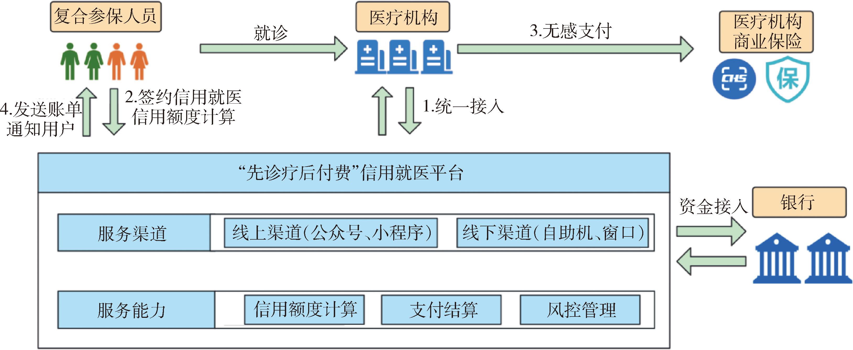 传统医疗结算流程需患者先付费后看诊,在挂号、治疗、检查、检验、取药等各环节多次排队缴费,耗费大量时间精力,给患者带来不便[1]。近年来,在政府支持与引导下,各级医疗机构充分认识便民惠民服务举措的重要意义,积极探索多元化“先诊疗后付费”就医新模式。该模式下患者只须在就诊结束后一次性结算费用,通过后置收费环节,优化就诊流程,提高患者就医效率,在一定程度上缓解了看病难的问题[2]。但在实践过程中也暴露出新的痛点和难点,如授信额度评估困难,信用支付平台生态发展滞后,信用就医服务场景单一,信用结算服务未覆盖所有参保类型患者等。因此,本研究探索信用体系在互联网医院“先诊疗后付费”模式中的应用,立足医院已建成的互联网医院平台进行患者服务功能扩展,建设信用就医平台,实现数据要素驱动的多场景、多渠道复合参保人群“先诊疗后付费”服务模式,创新性地将互联网医院平台、“先诊疗后付费”信用就医模式以及复合参保人群3个关键要素紧密结合,构建新的服务模式和应用场景,为患者创造更为便捷、高效的智慧服务体验。