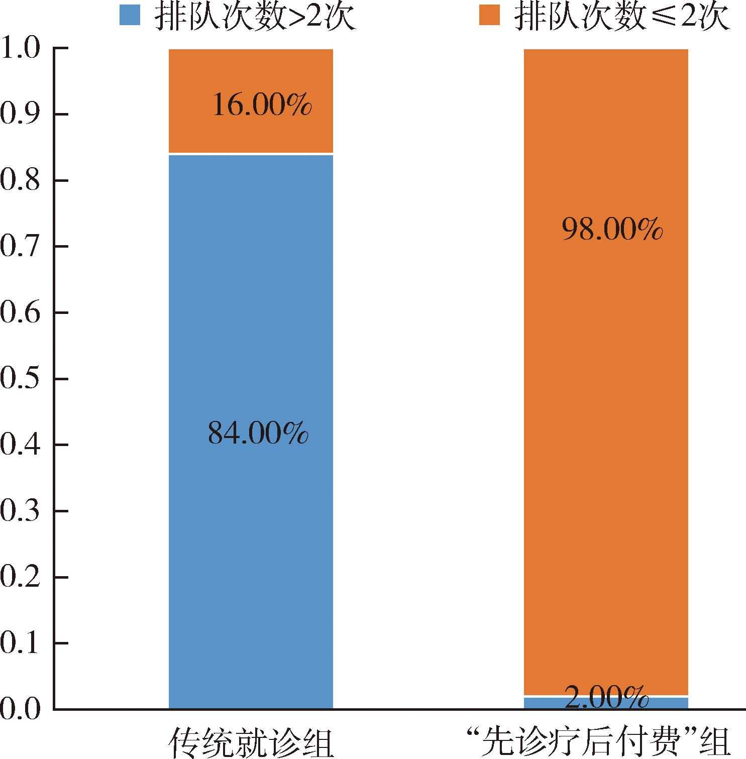 为量化本研究“先诊疗后付费”服务新模式所产生的效益,选取医院业务繁忙与相对清闲的两个时间段(每日上午8∶30—9∶30、下午4∶00—5∶00),连续5日,每日随机选取来院就诊患者20名,统计其挂号时长、就诊总时长与排队频次。同时,连续5日,每日选取20名志愿者签订“先诊疗后付费”信用就医服务协议,并安排其在相同时间段内挂号就诊,同样统计挂号时长、就诊总时长与排队频次。对比分析两组各100名患者的平均挂号时长、就诊总时长与排队频次,见图3—图4。在挂号等候时间方面,传统就诊组为10.15±3.09分钟,而“先诊疗后付费”组仅为2.08±0.68分钟,进行两独立样本t检验,t=25.51,P<0.001,差异具有统计学意义。在就诊总时长方面,传统就诊组为85.42±20.64分钟,“先诊疗后付费”组为56.13±16.71分钟,进行两独立样本t检验,t=11.03,P<0.001,差异具有统计学意义。结果表明,新模式的实施有效降低了非医疗环节的时间消耗,使患者就诊总时长缩短约34%。在排队频次方面,传统就诊组中有84%的患者排队超过两次,而“先诊疗后付费”组98%的患者排队频次在两次以下。采用Mann-Whitney U检验比较两组患者的排队频次差异,U=593,P<0.001,效应量r=0.76,差异显著,说明新模式显著减少了患者反复排队的情况。综上,“先诊疗后付费”信用就医模式能够显著缩短患者挂号时间与就诊总时长,并减少排队频次,优化就诊流程,提升服务效率。