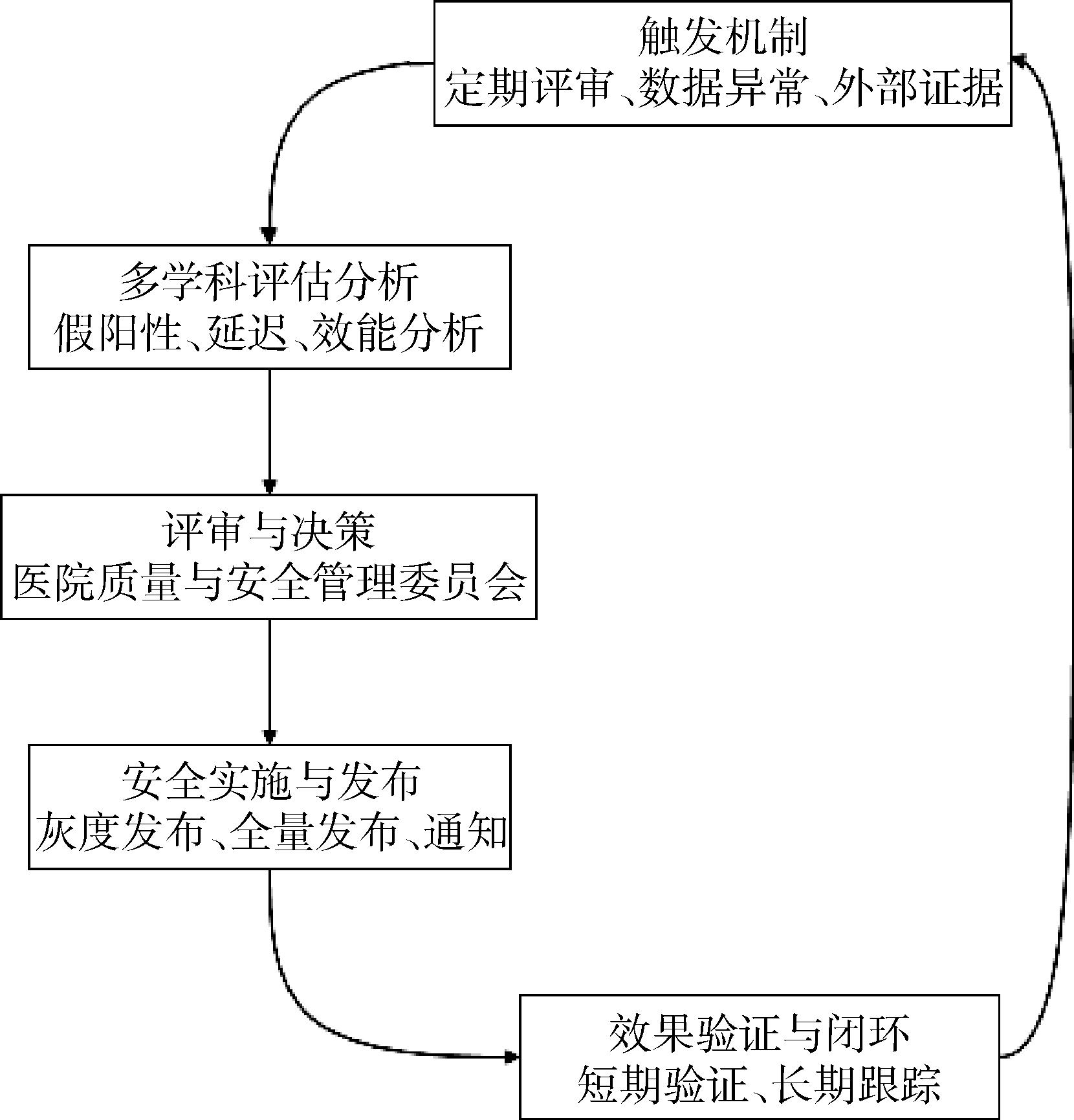 危急值规则库并非静态配置,而是持续演进的知识体系。平台建立“监测-评估-评审-实施-验证”闭环迭代流程,确保规则库的准确性、适应性与先进性。规则库迭代优化主要由3类事件触发。一是定期评审,每季度由质量管理处与安全管理委员会例行发起评审会议。二是数据异常触发,如假阳性率偏高、处置延迟率偏高、规则命中率过低。三是外部证据触发,如新版行业标准发布、临床诊疗指南发生重大更新或引进新型检测方法时。触发迭代流程后,由检验科、相关临床科室专家、医务处、信息处等部门组成临时评估小组,利用平台提供的数据进行根因分析,形成“规则变更方案”,并提交医院质量与安全管理委员会进行最终评审,评审决策应基于临床证据、数据证据和政策依据,并通过投票形成决议。通过评审的规则变更,由信息处在测试环境验证后,通过规则库版本化管理功能进行部署并通知相关人员。新规则发布后,连续4周重点监控新规则的触发量、假阳性率和相关项目处置时效的变化趋势,比较迭代前后效果。至此,规则库完成一次完整迭代闭环。该流程通过制度化和信息化手段,确保了危急值规则库既能保持稳定性,又能敏捷地响应临床需求与医学进步,最终持续提升危急值管理的精准性与安全性。