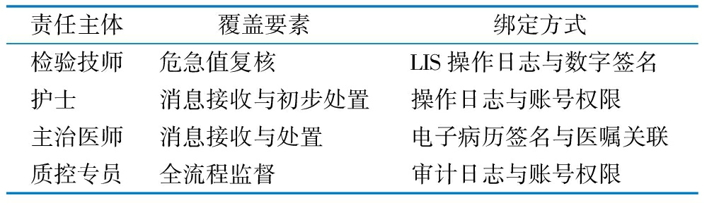 责任主体覆盖要素绑定方式检验技师危急值复核 LIS操作日志与数字签名 护士 消息接收与初步处置操作日志与账号权限 主治医师消息接收与处置 电子病历签名与医嘱关联质控专员全流程监督 审计日志与账号权限
