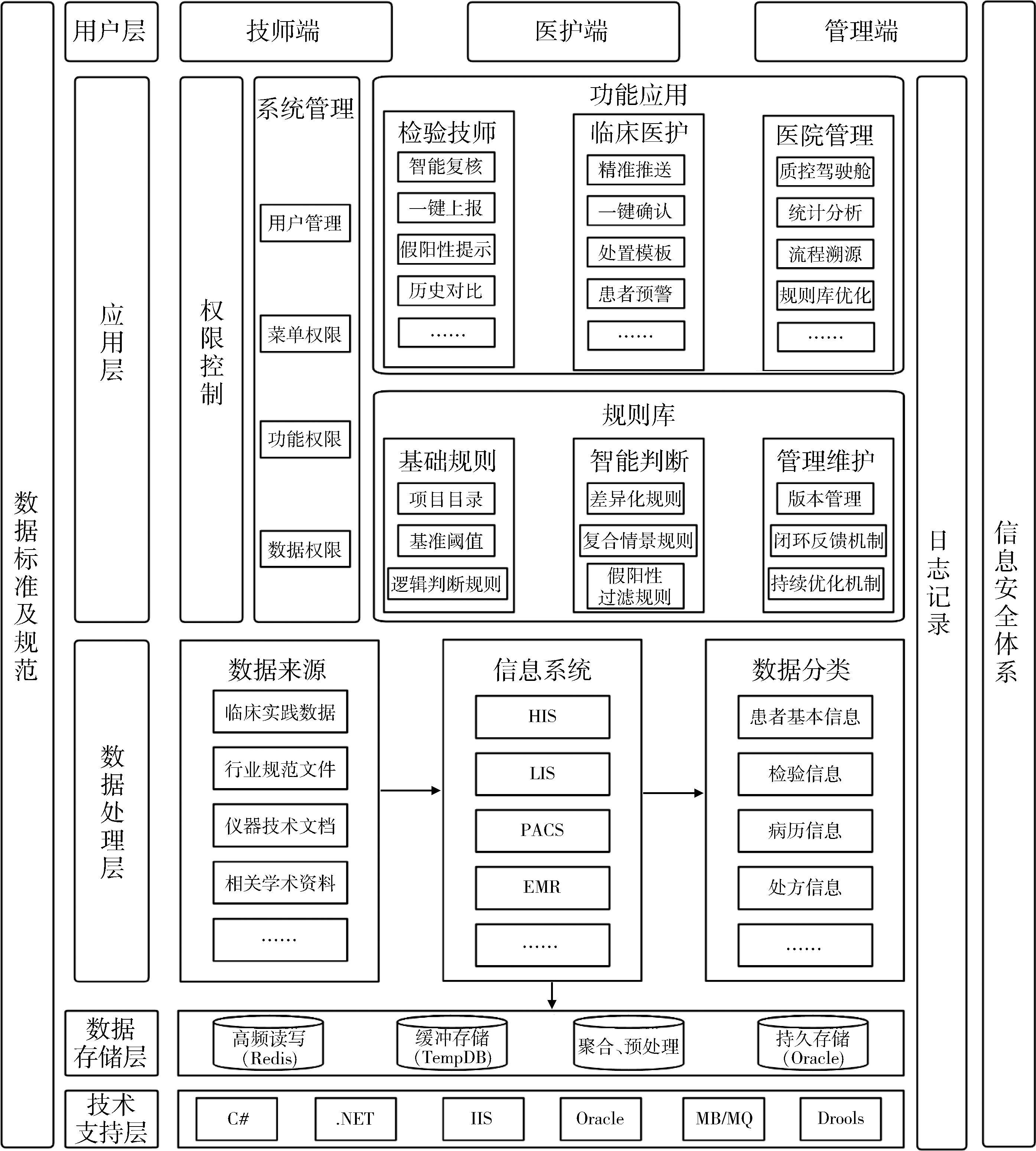 技术支持层采用C#与.NET构建开发框架,依托互联网信息服务(internet information services,IIS)实现接口服务部署,结合Oracle数据库保障结构化数据存储持久化[14],通过MB/MQ实现异步通信,支撑系统高并发、低延迟的运行需求,利用Drools结合规则库建立规则引擎,实现检验危急值的智能监测。数据存储层针对业务数据高频读写、中间缓存、长期归档的差异化需求,设计3级存储架构:高频读写(Redis)缓存危急值实时状态[15]、用户待办任务等高频交互数据,提升响应速度;缓冲存储(tempDB)暂存多源数据聚合、预处理结果,降低核心数据库压力;持久存储(Oracle)存储标准化临床数据、规则库配置等核心业务数据,保障数据完整性。数据处理层整合HIS、卫生健康委员会平台、仪器设备、文献专著等多源数据,通过“采集-整合-分类”流程实现数据治理,通过接口服务及消息队列对接异构系统采集数据,突破数据孤岛,清洗、关联患者基本信息、检验结果、预后等多维数据,并进行整合,最终输出标准化数据,为上层应用提供支撑。应用层除系统管理外,围绕权限控制、功能应用、规则库3大模块,实现角色适配、流程闭环、智能决策相关功能,保障患者隐私及数据安全,提升危急值判读准确性与效率。规则库模块包括基础规则、智能判断、管理维护3部分,基础规则定义检验项目目录、基准阈值、逻辑判断规则等,智能判断中嵌入患者个体差异化规则、临床情景差异化规则、假阳性规则等,管理维护支持规则库版本管理、管理权限控制,并制定版本迭代升级机制,保障规则库动态迭代与安全管控。